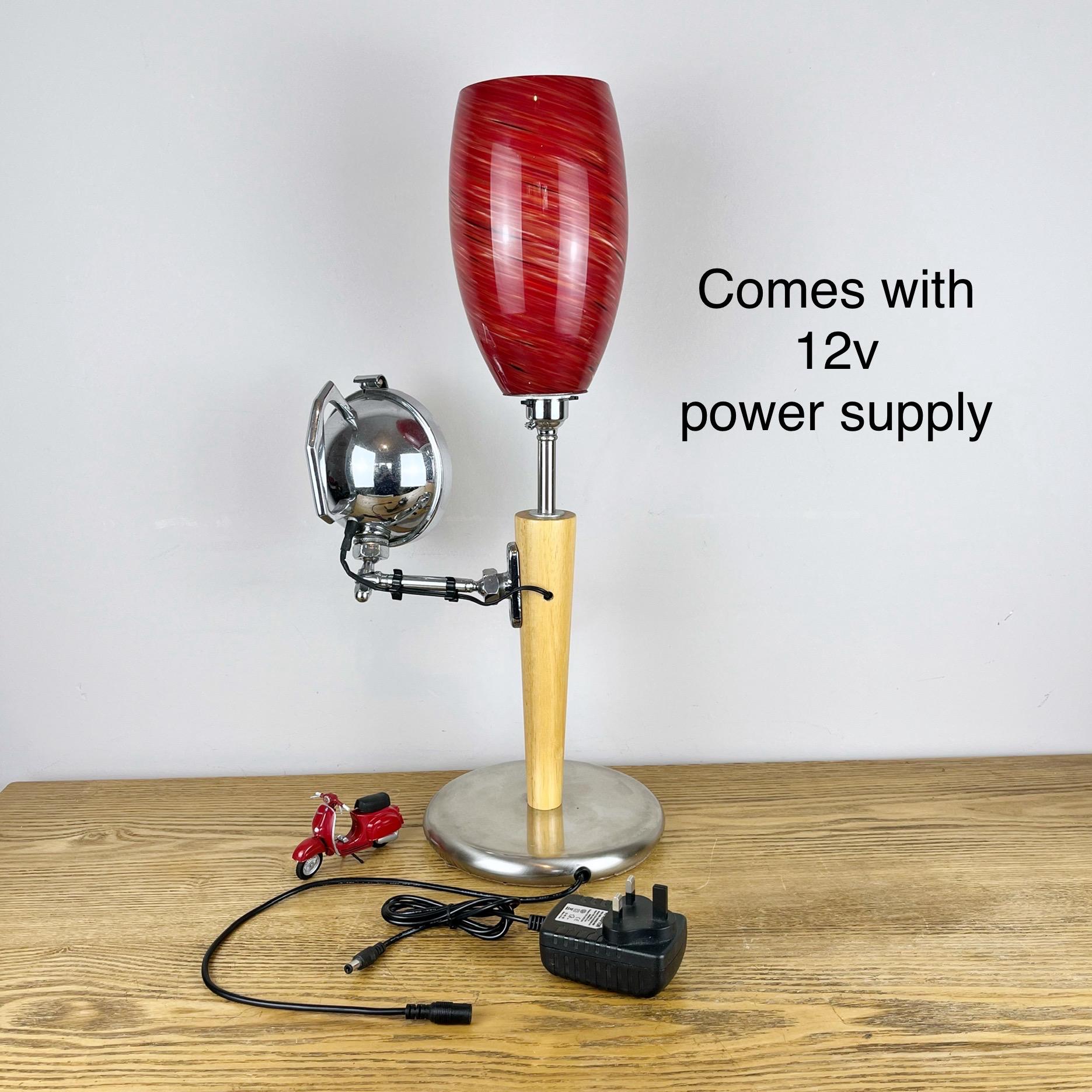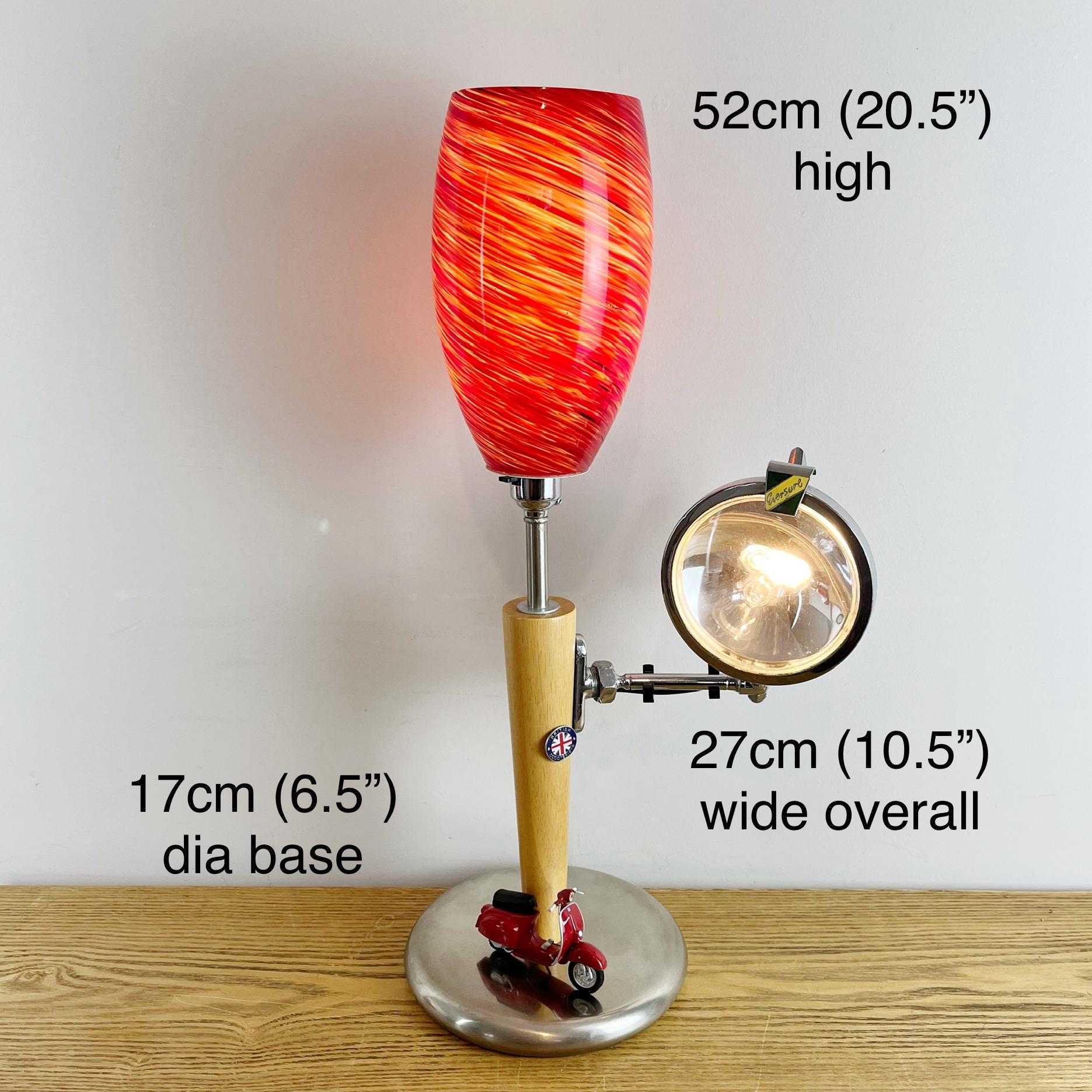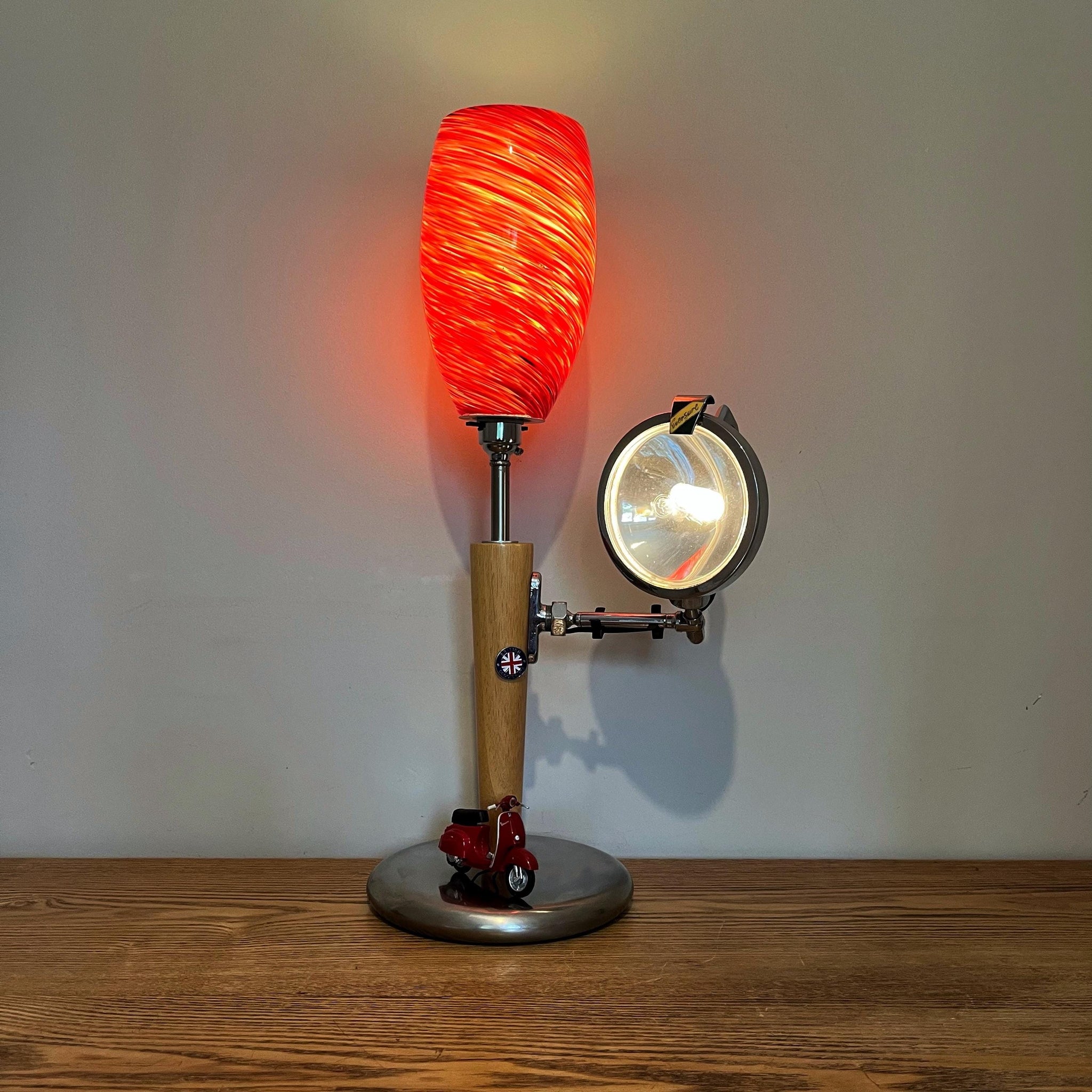 Made using an original 1950’s - 60’s original multi directional spot lamp made by EVERSURE. These were a classic addition on many scooters due to the mounting leg. It is mounted on a chrome and wood lamp base fitted with a stunning vintage red glass lampshade. Both lamps have replaceable 12v bulbs powered by a mains supply with an inline dimmer switch. To complete the classic scooter theme the lamp has a British scooters badge and a free standing diecast model of a Vespa 90 Super Sprint.
