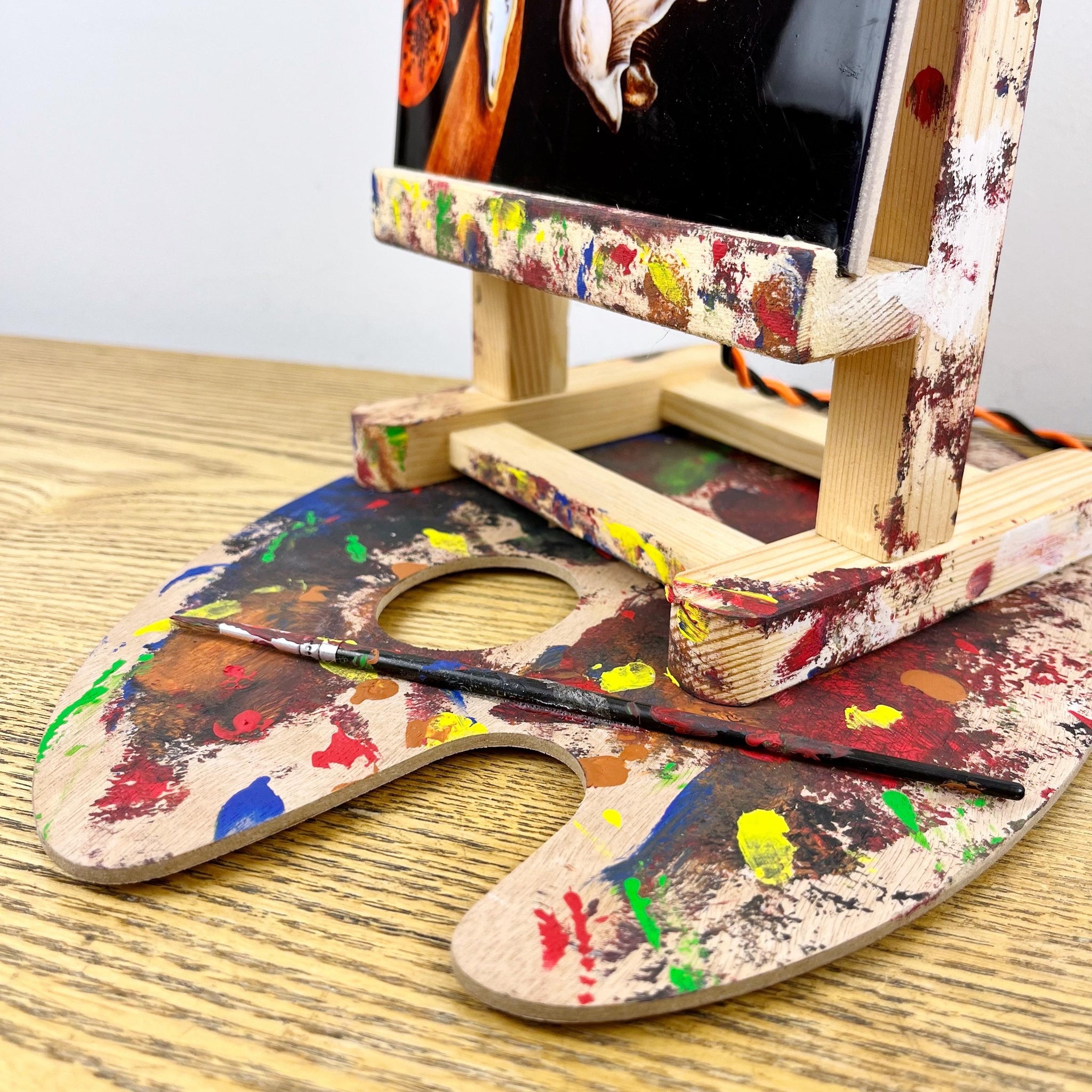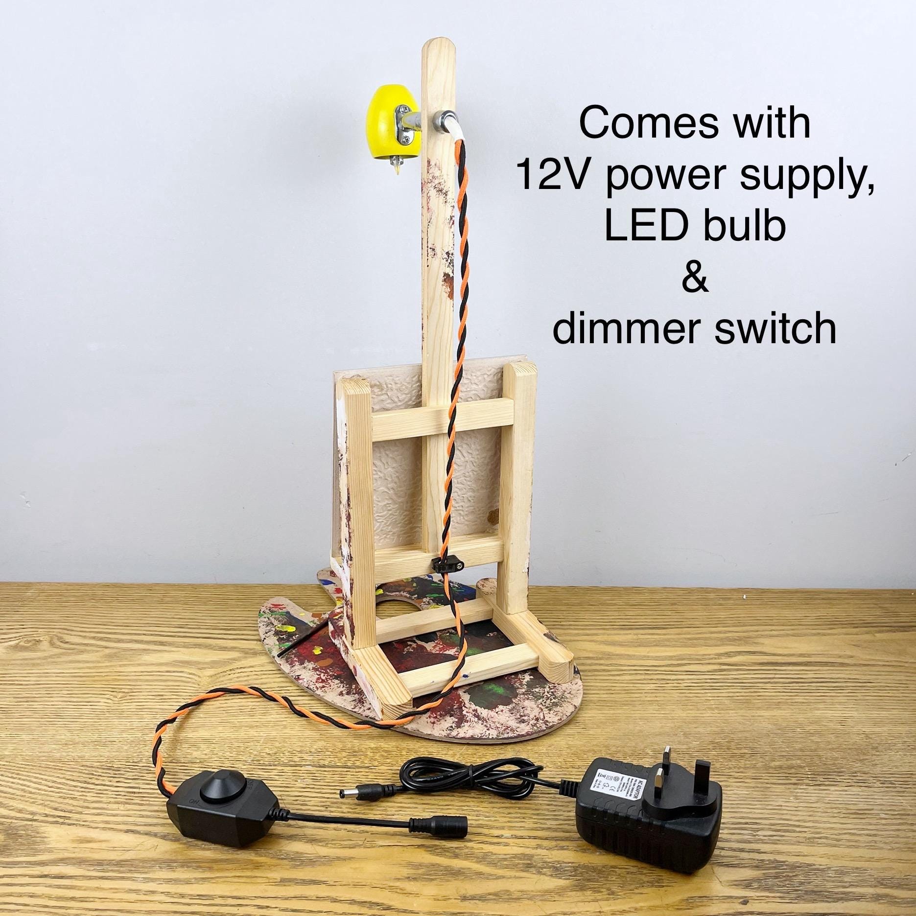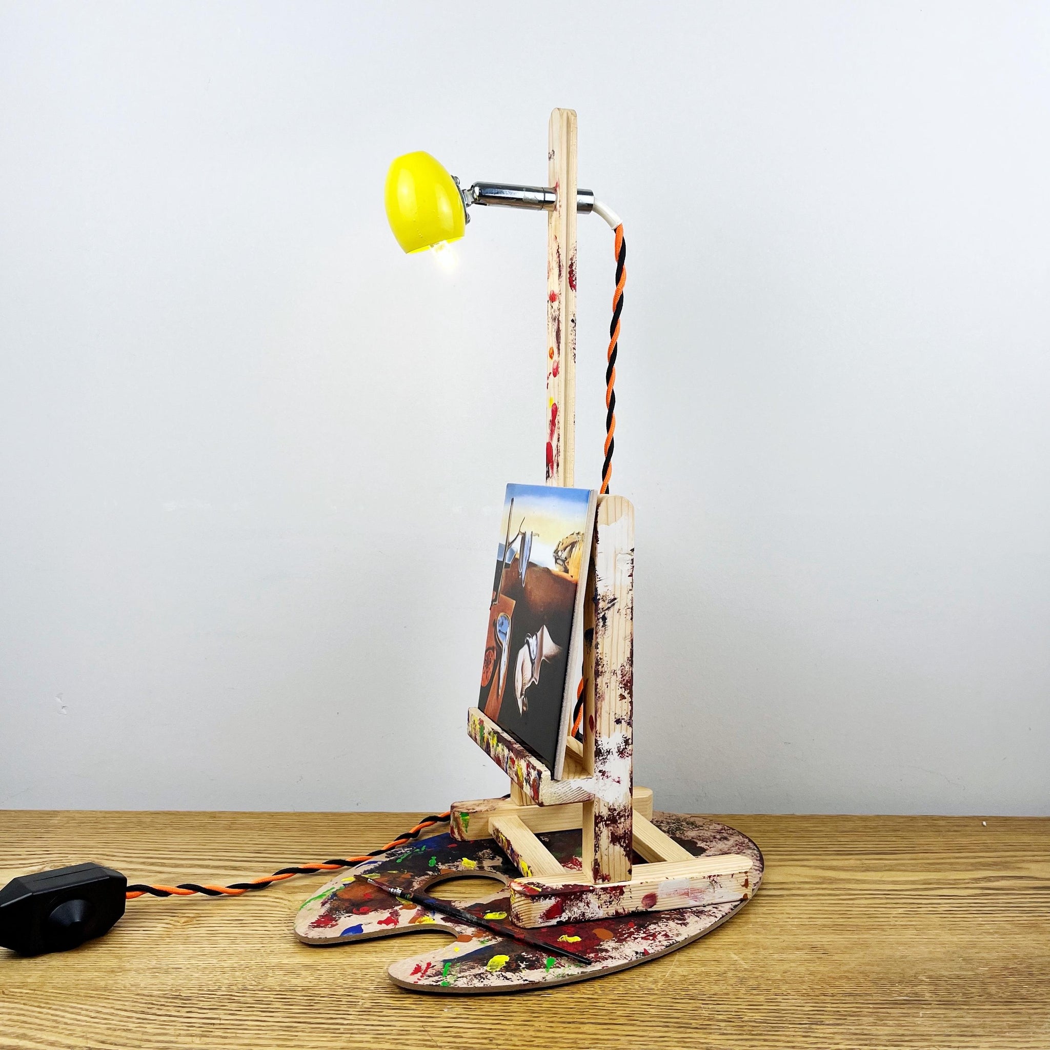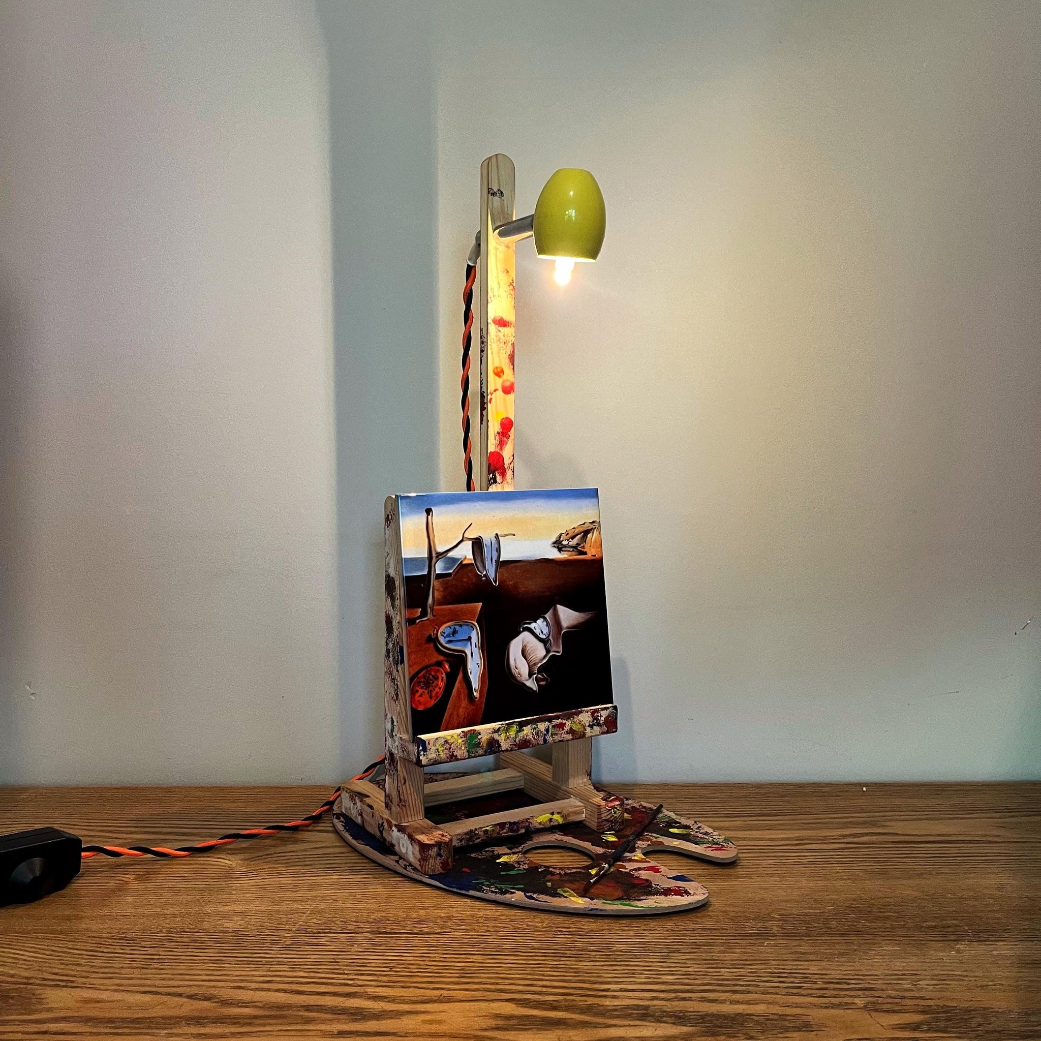 Created from a small easel mounted on a used paint pallet together with a surrealist Salvador Dali theme ceramic tile. It has a small adjustable angle lamp with replaceable led bulb and powered by a mains 12v power supply complete with dimmer