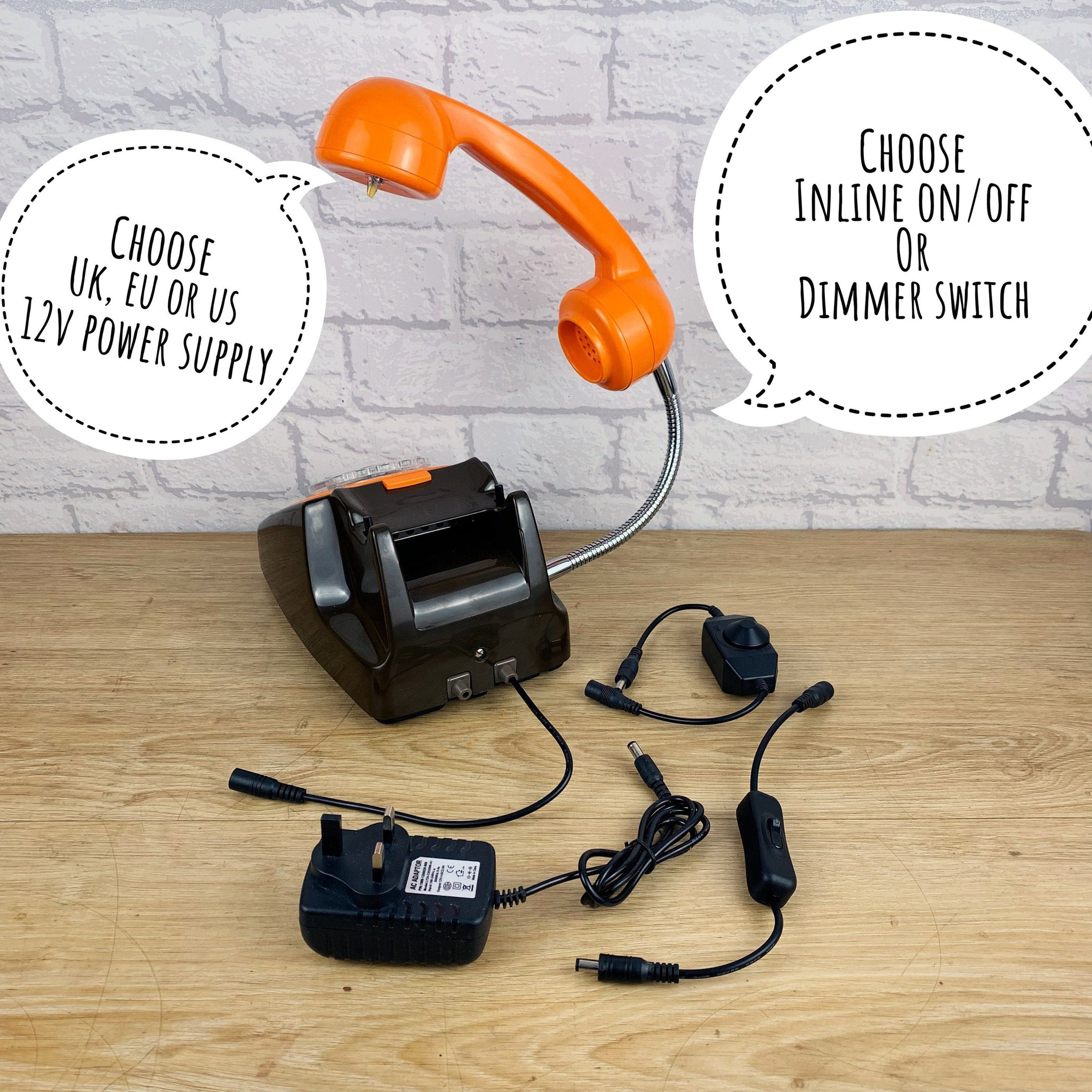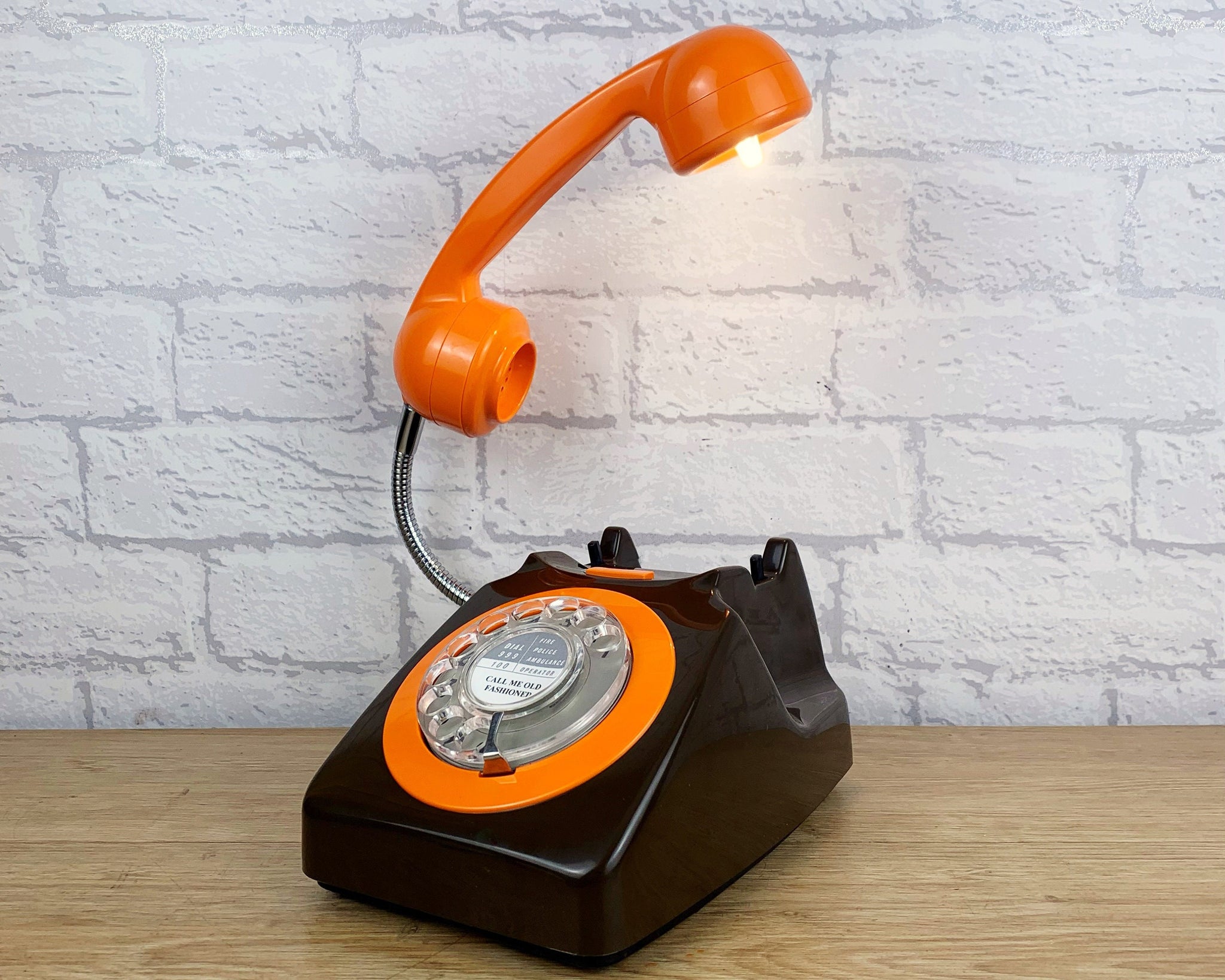 A quirky lamp made from a retro phone. The base of the lamp is a classic black rotary phone with an orange colored dial ring. The orange handset mounted on a flexible gooseneck has a small LED bulb in the receiver converting it into a fabulous lamp.