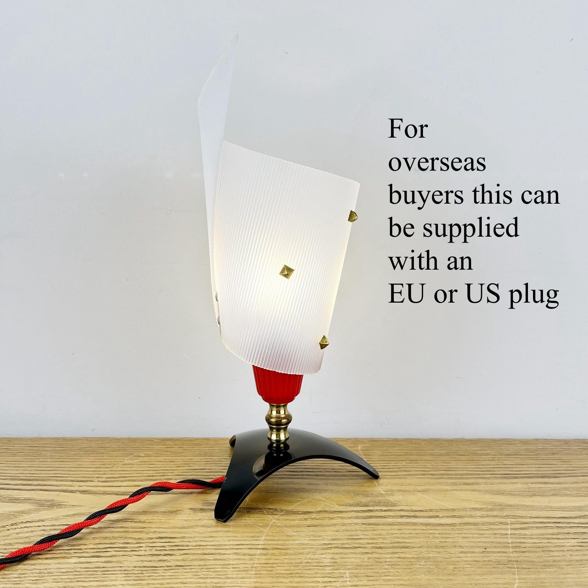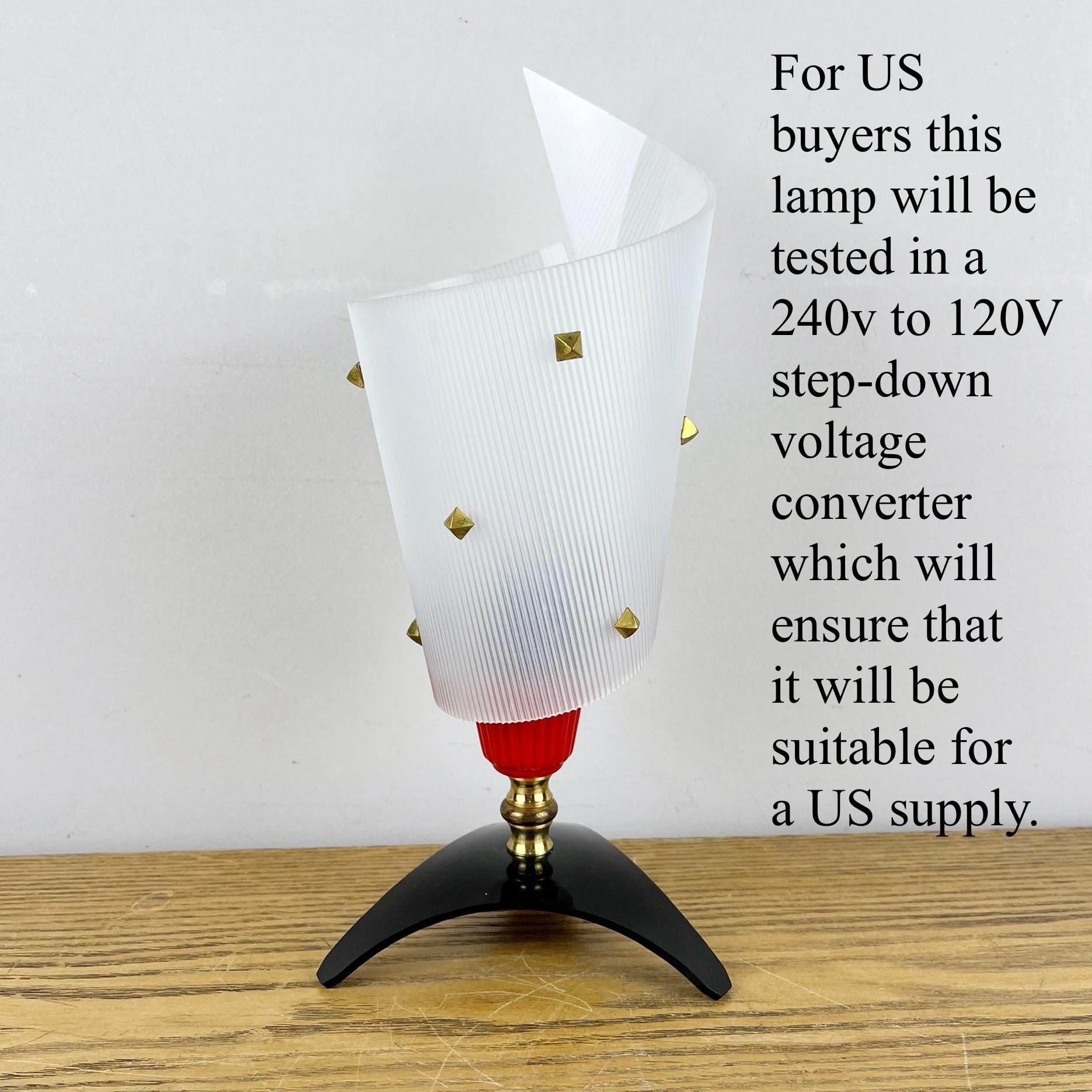 Made in the 1960’s this lamp was one of various designs made by Pierre Guariche in popular space age atomic styles using the same component parts. Made from acrylic plexiglass / perspex with brass spacers. It has been dismantled, sympathetically cleaned and rewired on red & black braided cable. Fitted with a new small Edison screw bulb holder with an original inline torpedo switch which has been spray painted.