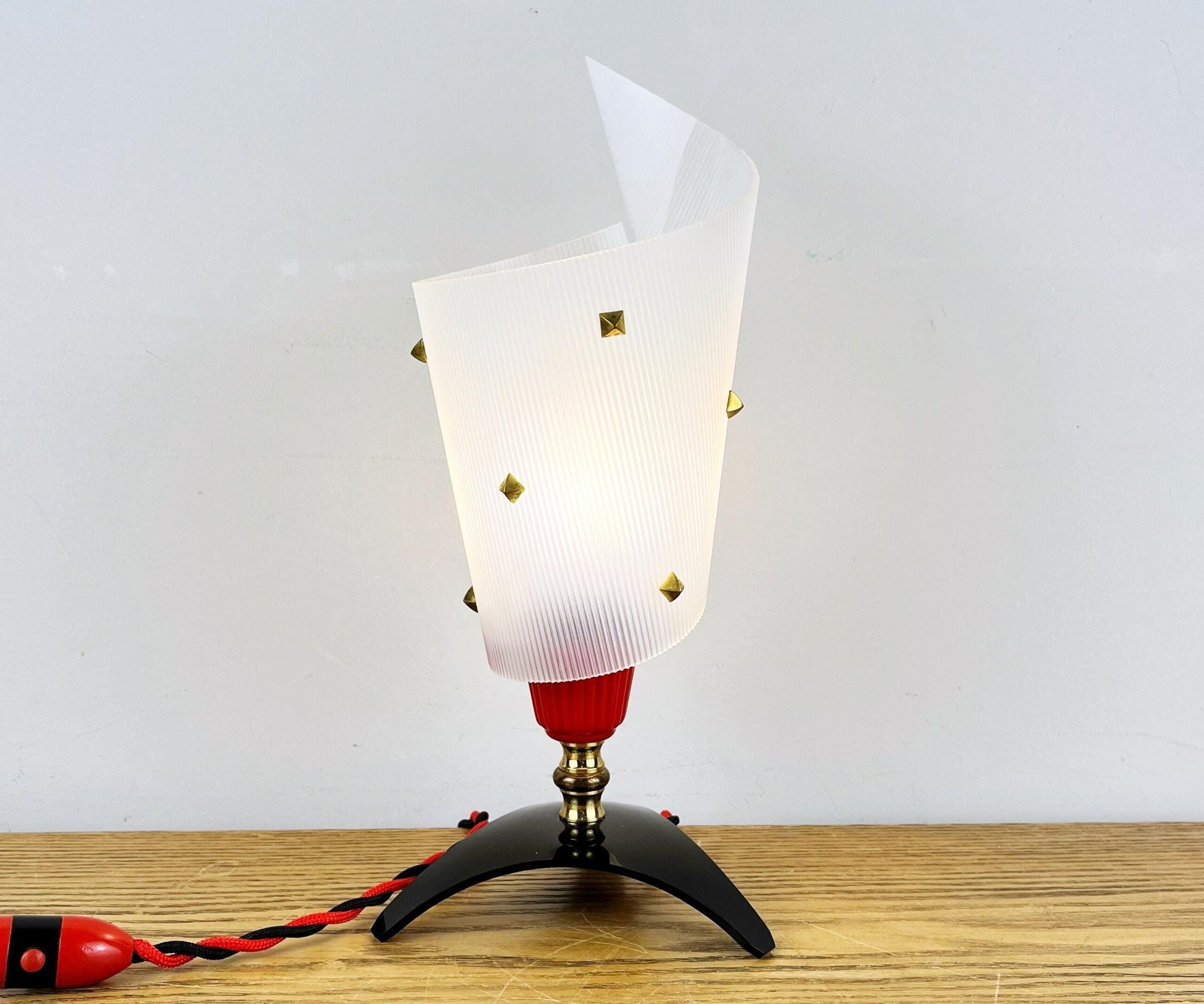 This mid century atomic red & black lamp is the perfect lighting for a lover of vintage space age decor. This would look gorgeous in a retro style lounge or in any home with a more modern contemporary look as an eye catching statement piece.