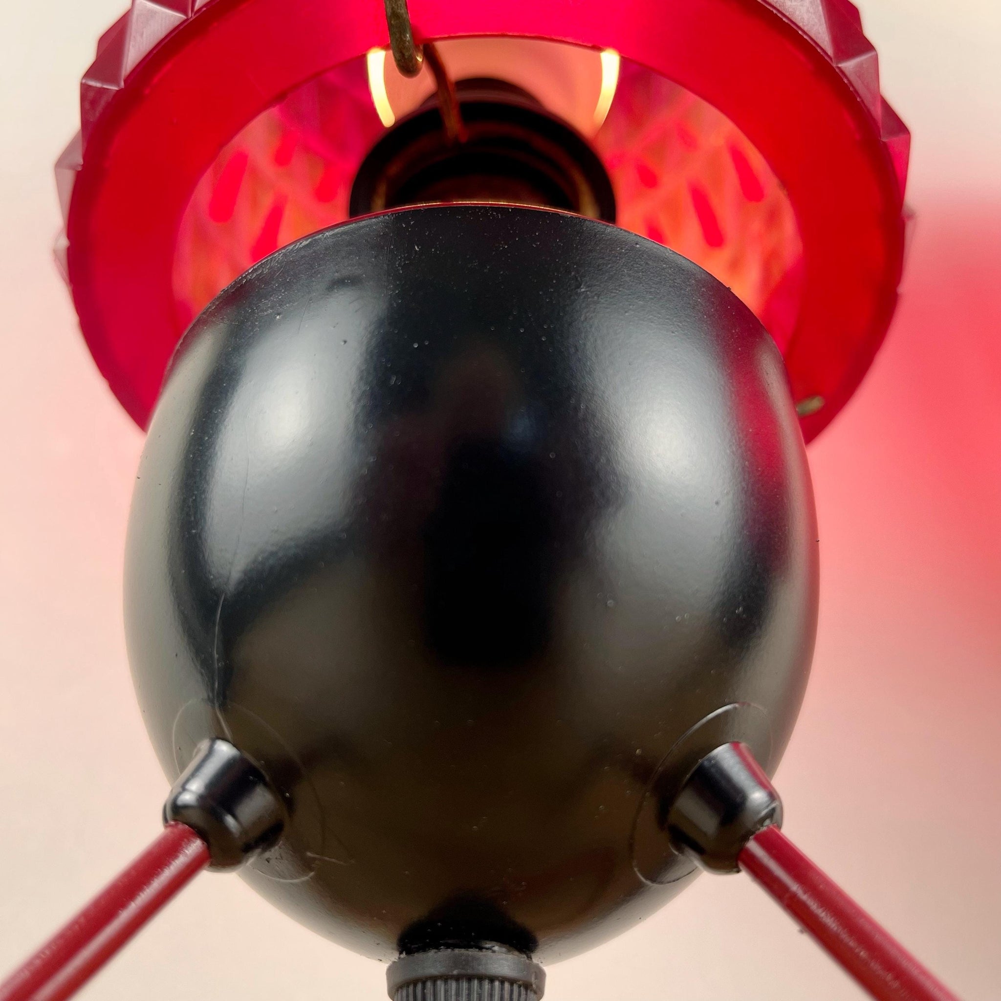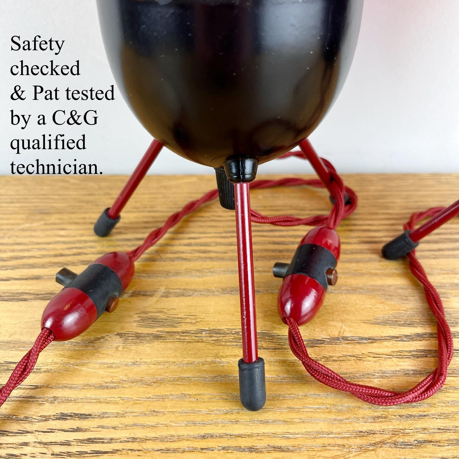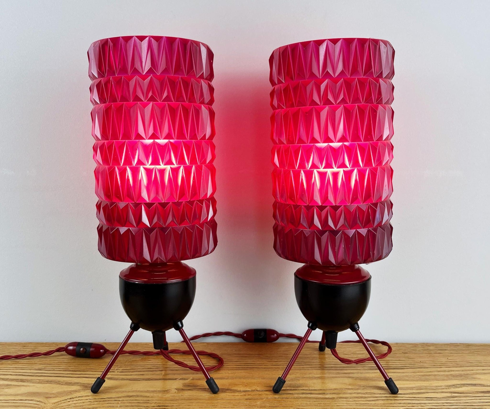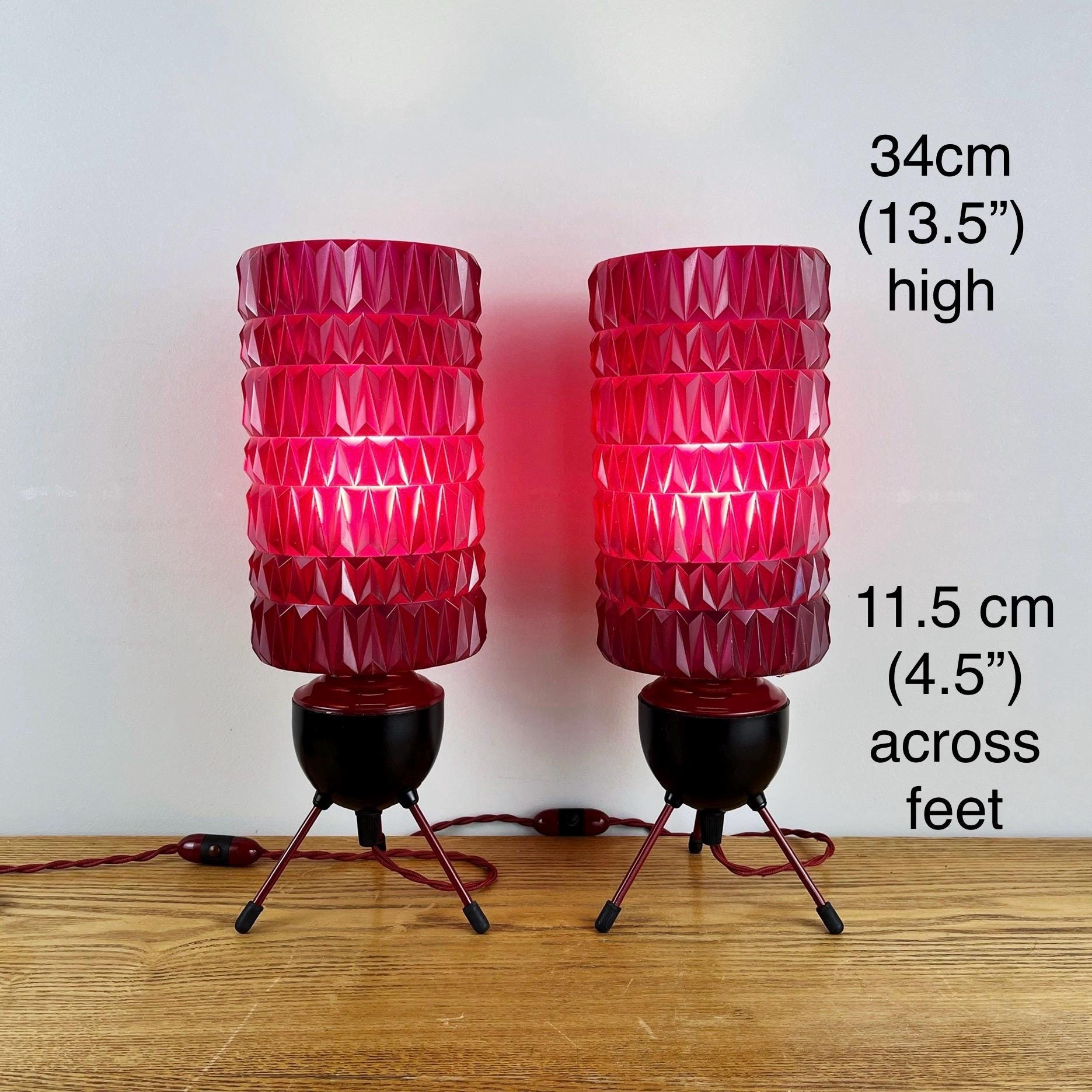 This stunning pair of mid century atomic burgundy / mulberry coloured tripod lamps are the perfect lighting for a lover of space age decor. These will look gorgeous in a vintage style lounge or in any home with a more modern contemporary look as eye catching statement pieces or as mid century modern bedside lighting.
