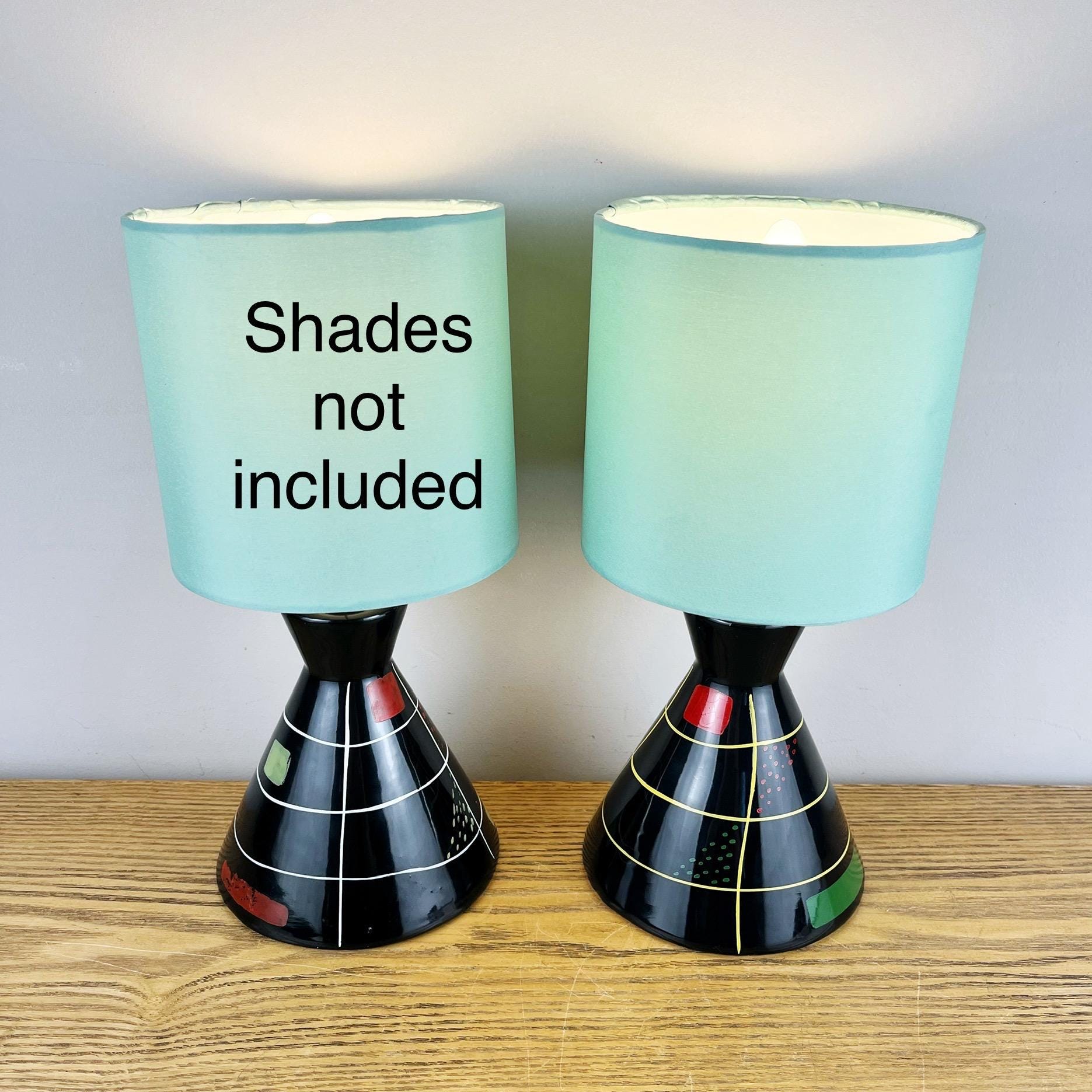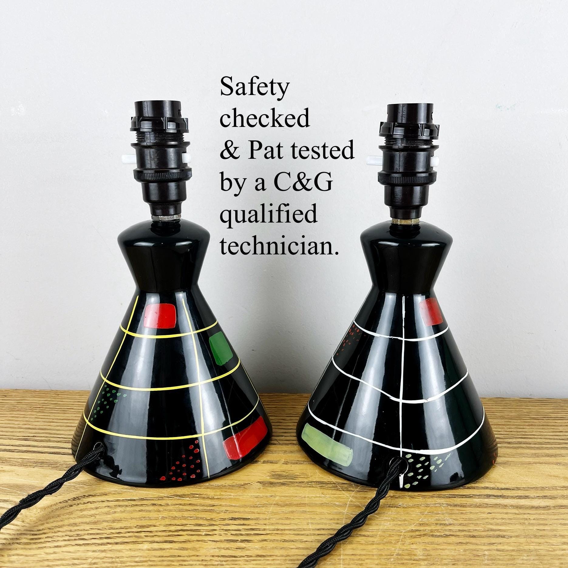 This pair of Mid Century Ceramic atomic style lamps are very stylish retro lights that will complement any vintage 50’s -60s home decor. They are a non matching pair being the same design model with slight colour variations. Both are black glaze with red and green abstract highlights one with white glazed lines the other with yellow. They look great together & would look gorgeous as bedside lights in a vintage setting, or in a lounge with a more modern contemporary look as eye catching statement pieces.
