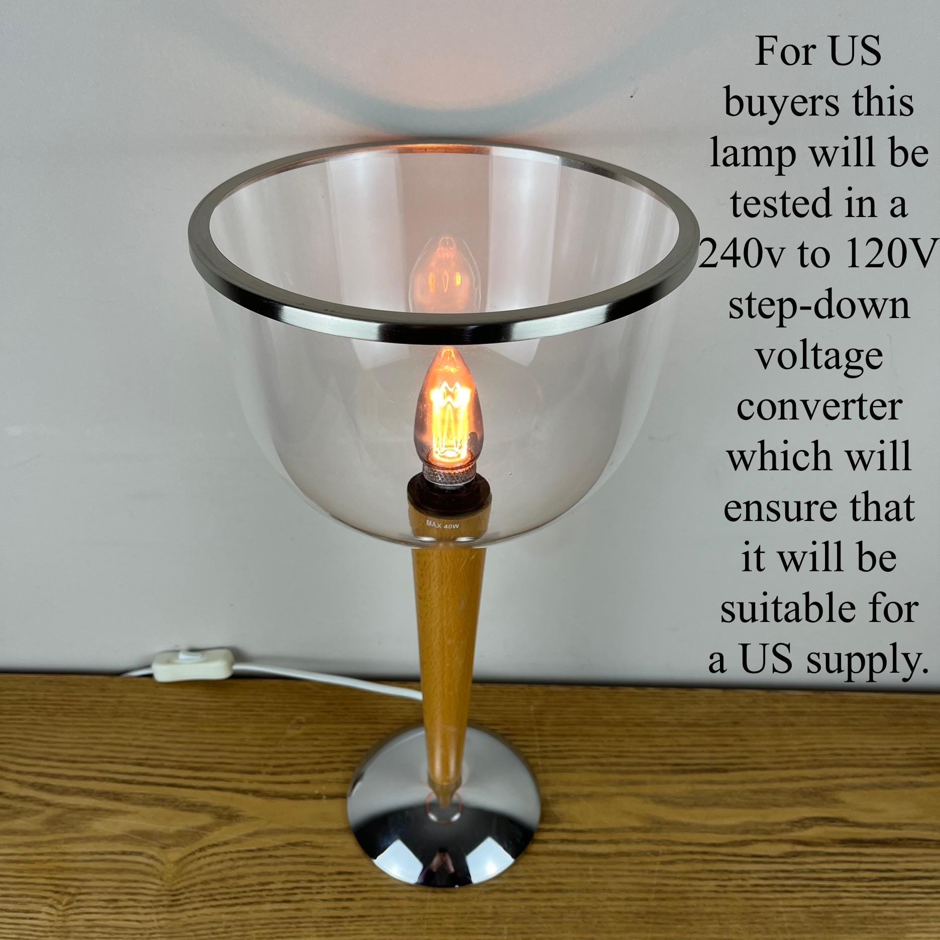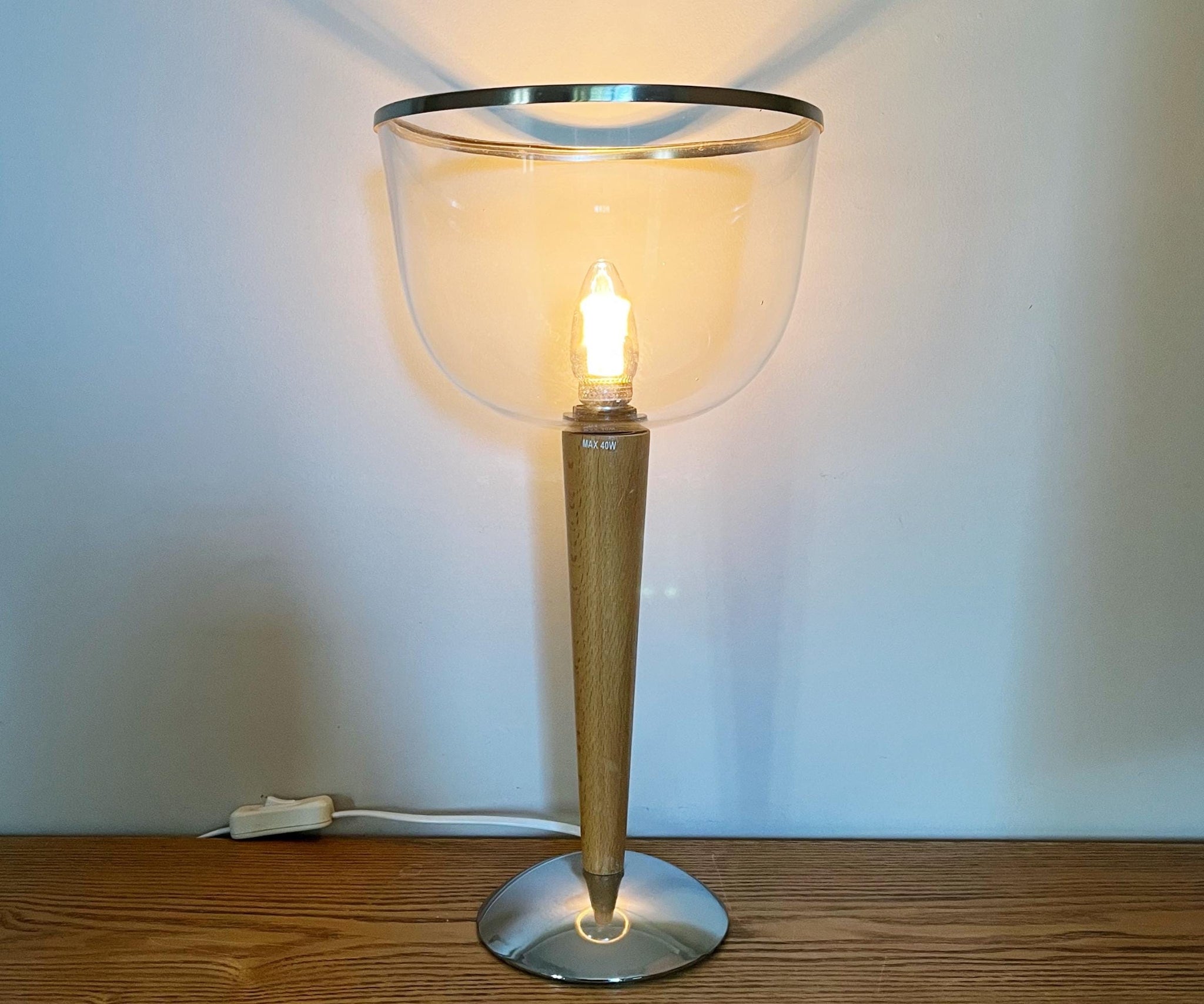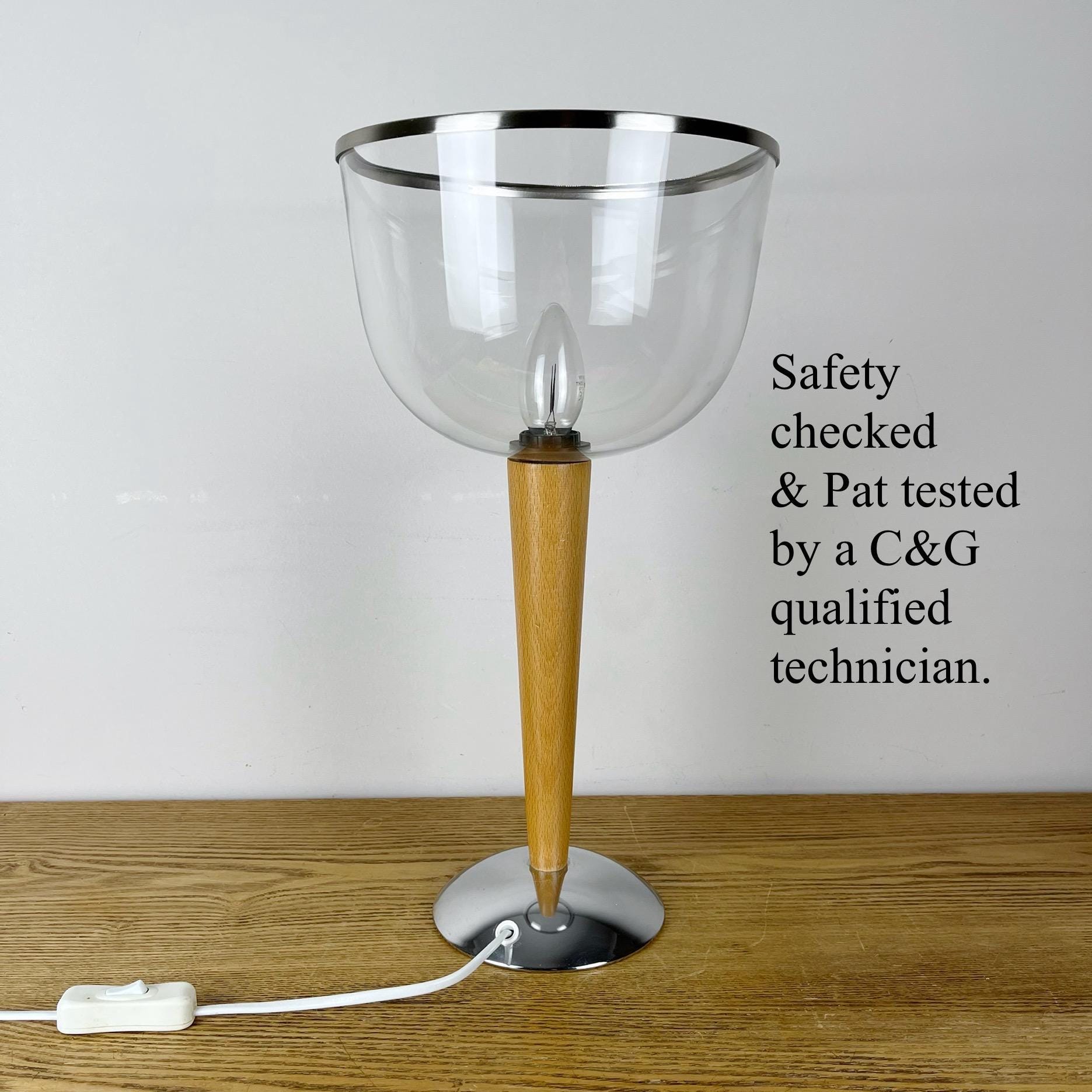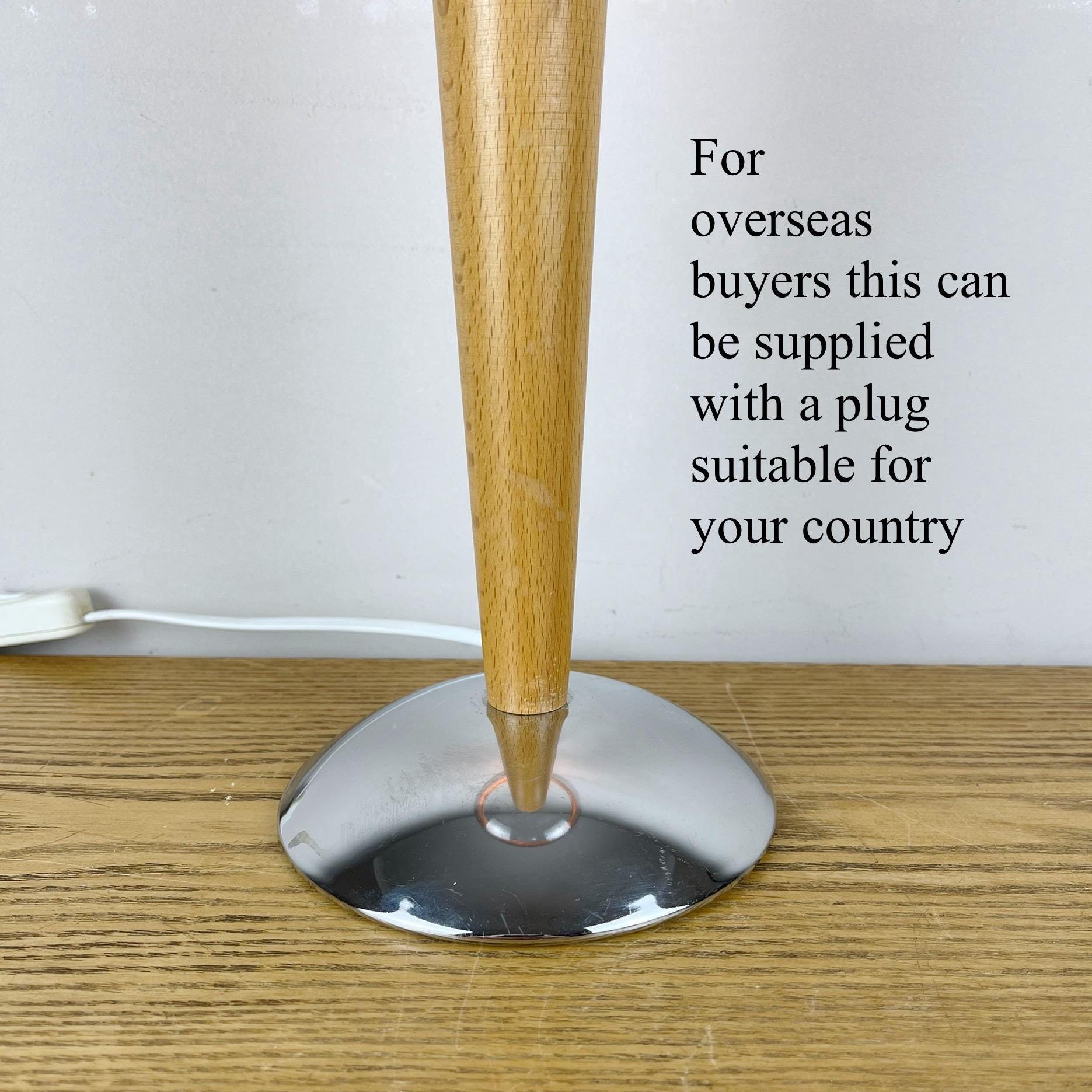 Although very Art Deco in style this lamp has been created with a marriage of a glass uplighter shade with a 1990’s IKEA lamp base. The base has a model name of KVINTOL and has become a quite sought after lamp in its own right due to its design of a chrome base with an upward tapering beech wood column. The original e14 bulb holder wiring and in line switch have all been retained and safety tested. The lamp will come with both the LED bulbs pictured.