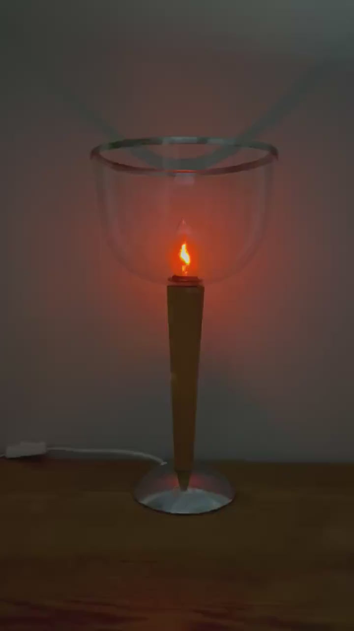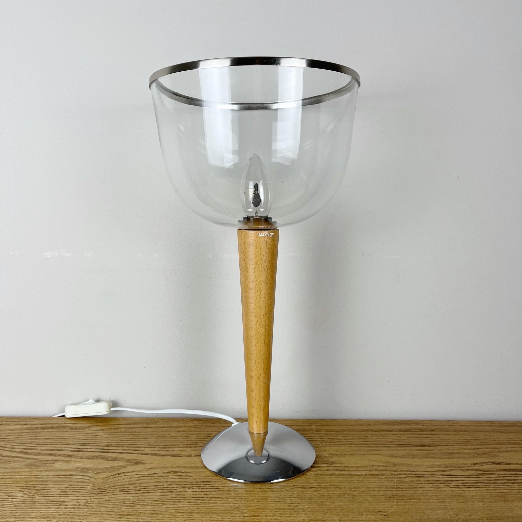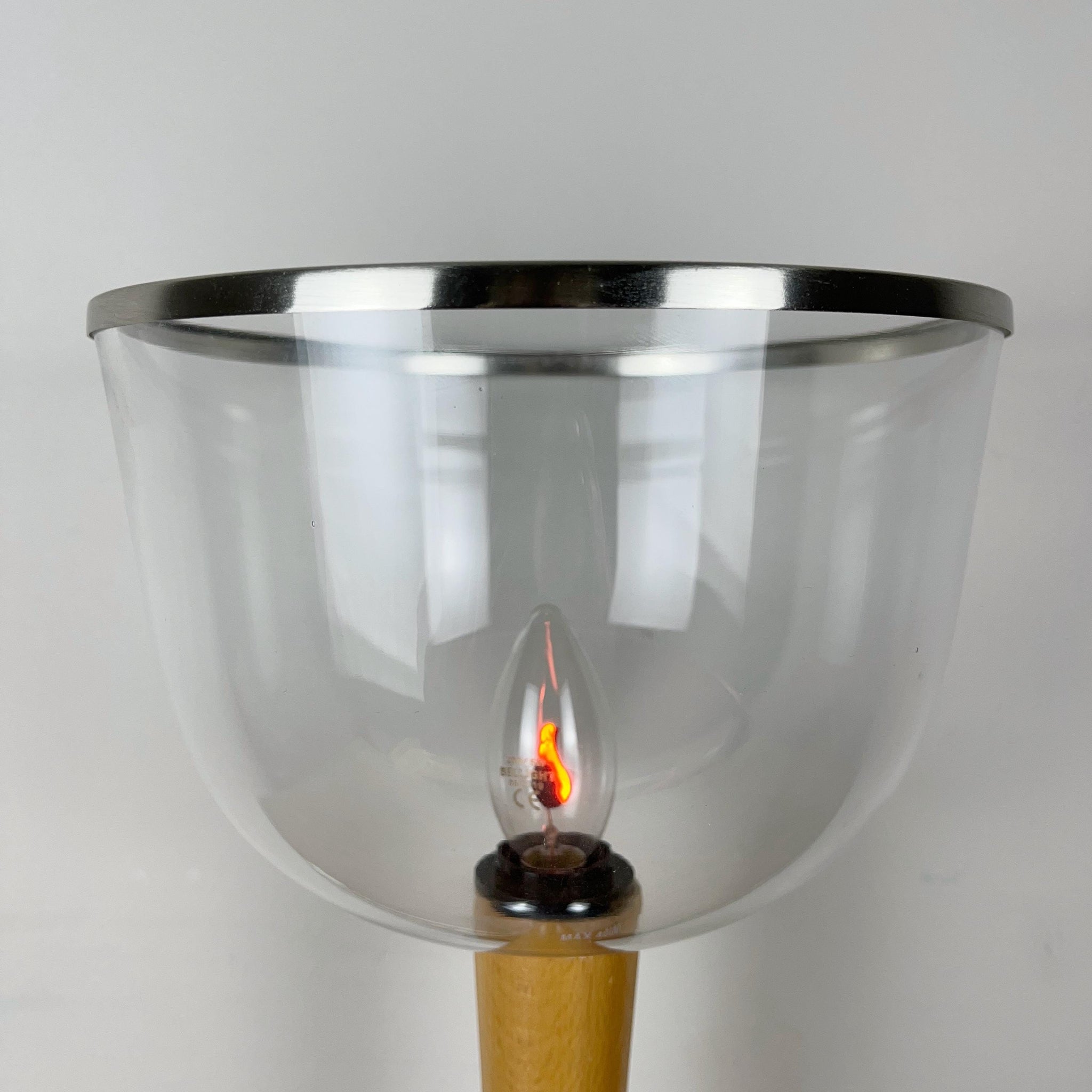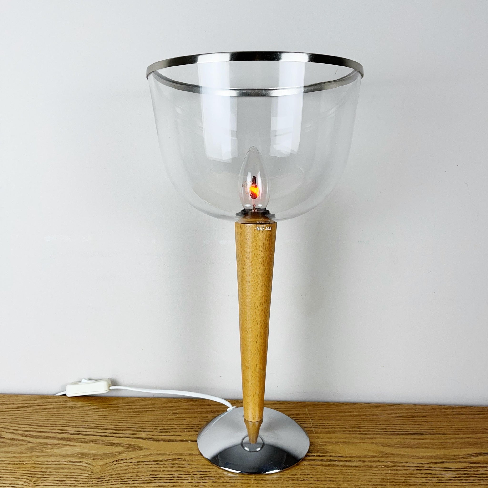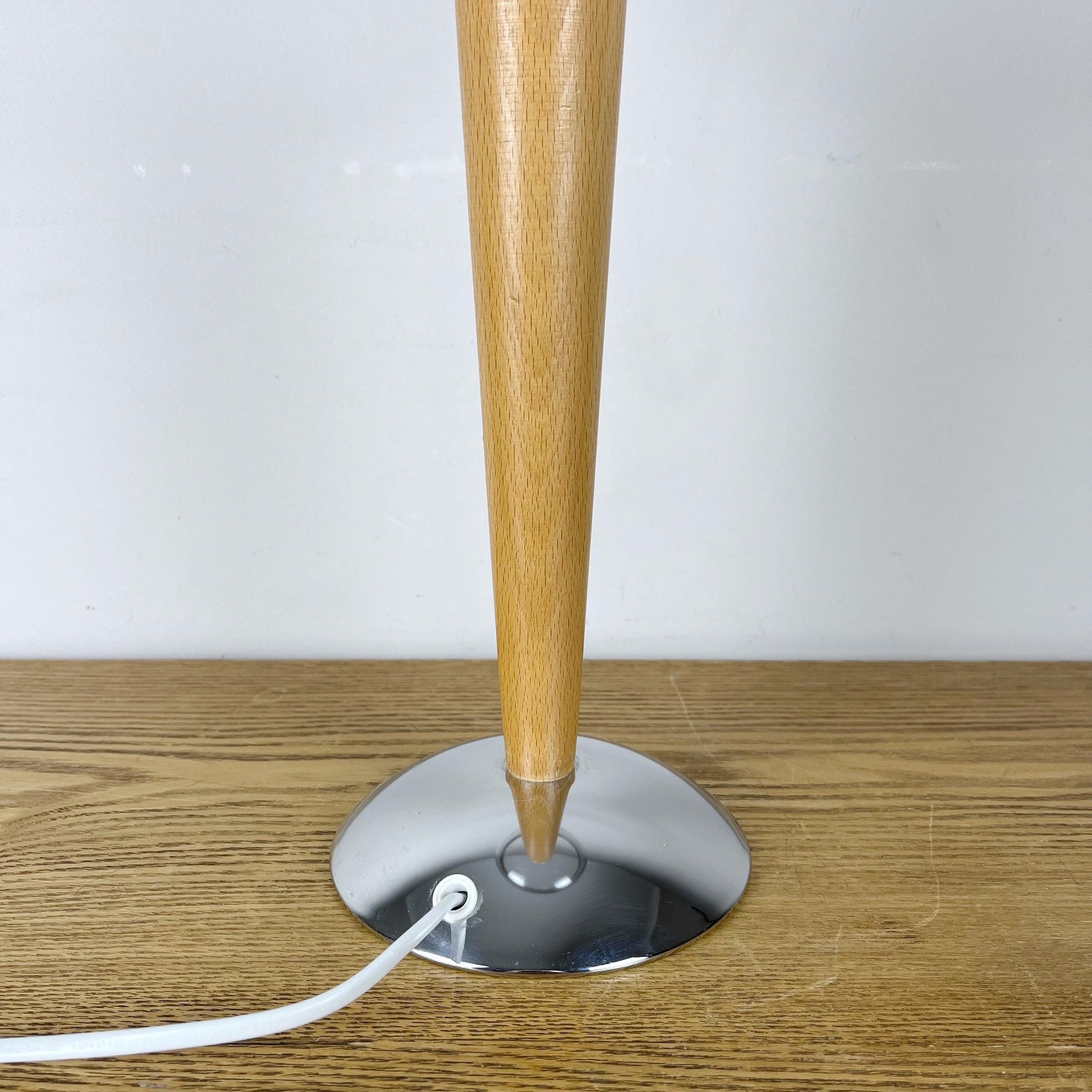 Although very Art Deco in style this lamp has been created with a marriage of a glass uplighter shade with a 1990’s IKEA lamp base. The base has a model name of KVINTOL and has become a quite sought after lamp in its own right due to its design of a chrome base with an upward tapering beech wood column. The original e14 bulb holder wiring and in line switch have all been retained and safety tested. The lamp will come with both the LED bulbs pictured.