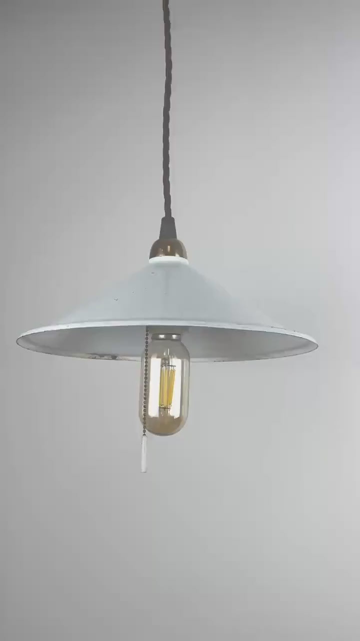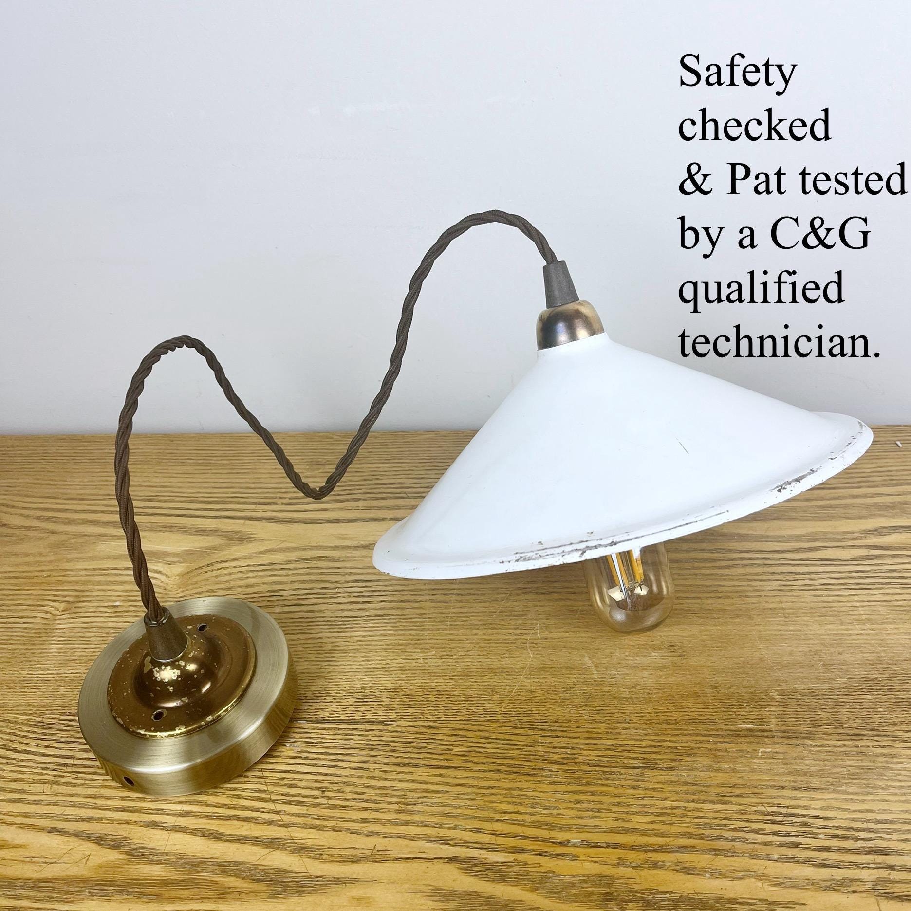 This small white painted metal coolie shade light fitting has a very French Cafe or industrial feel to it. Probably dating from the 1930’s. Complete with its original pull switch large Edison screw bulb holder and its original ceiling fitting which is mounted on a contemporary rose for ease of fitting. Rewired on braided cable with earth and ready to fit having been safety checked & tested.