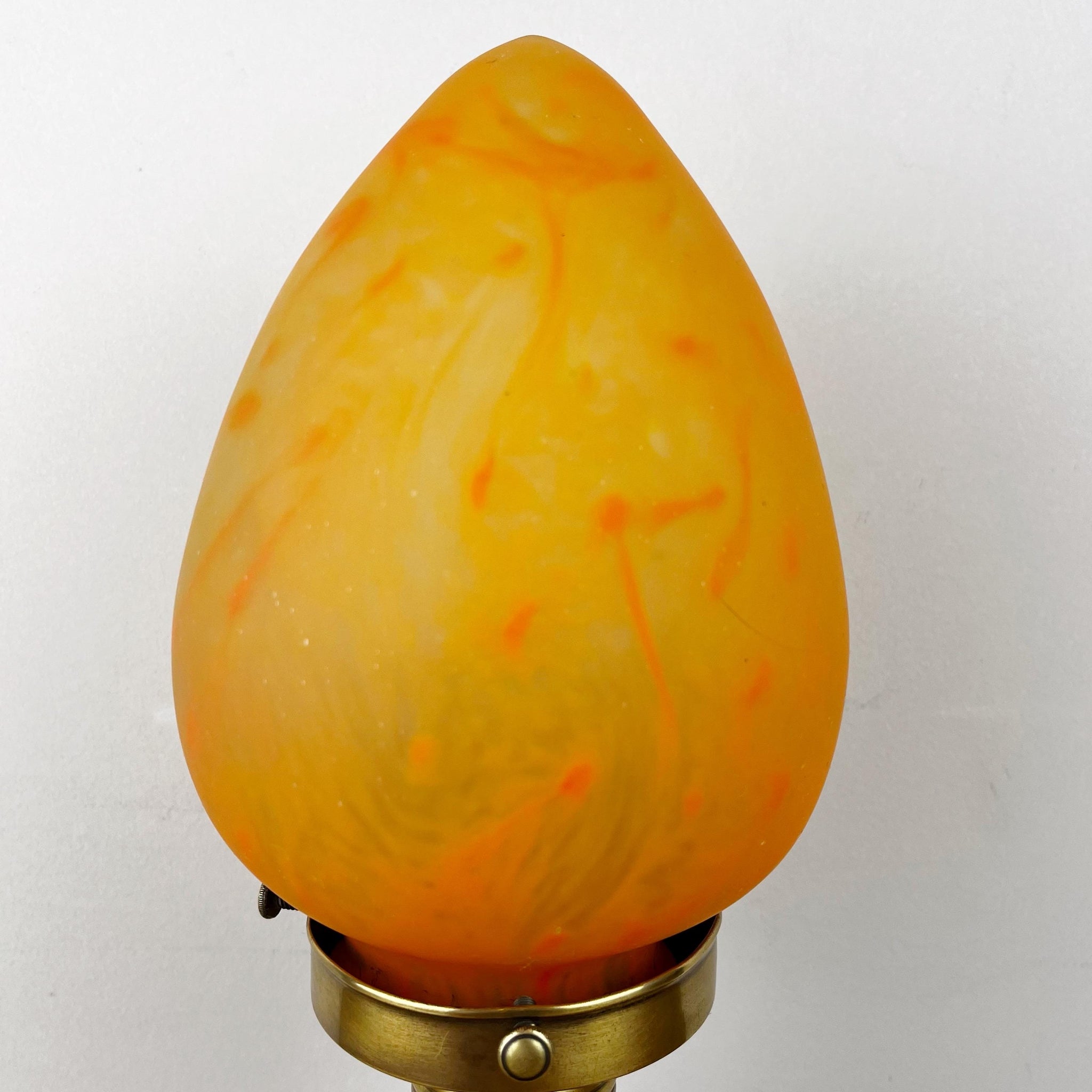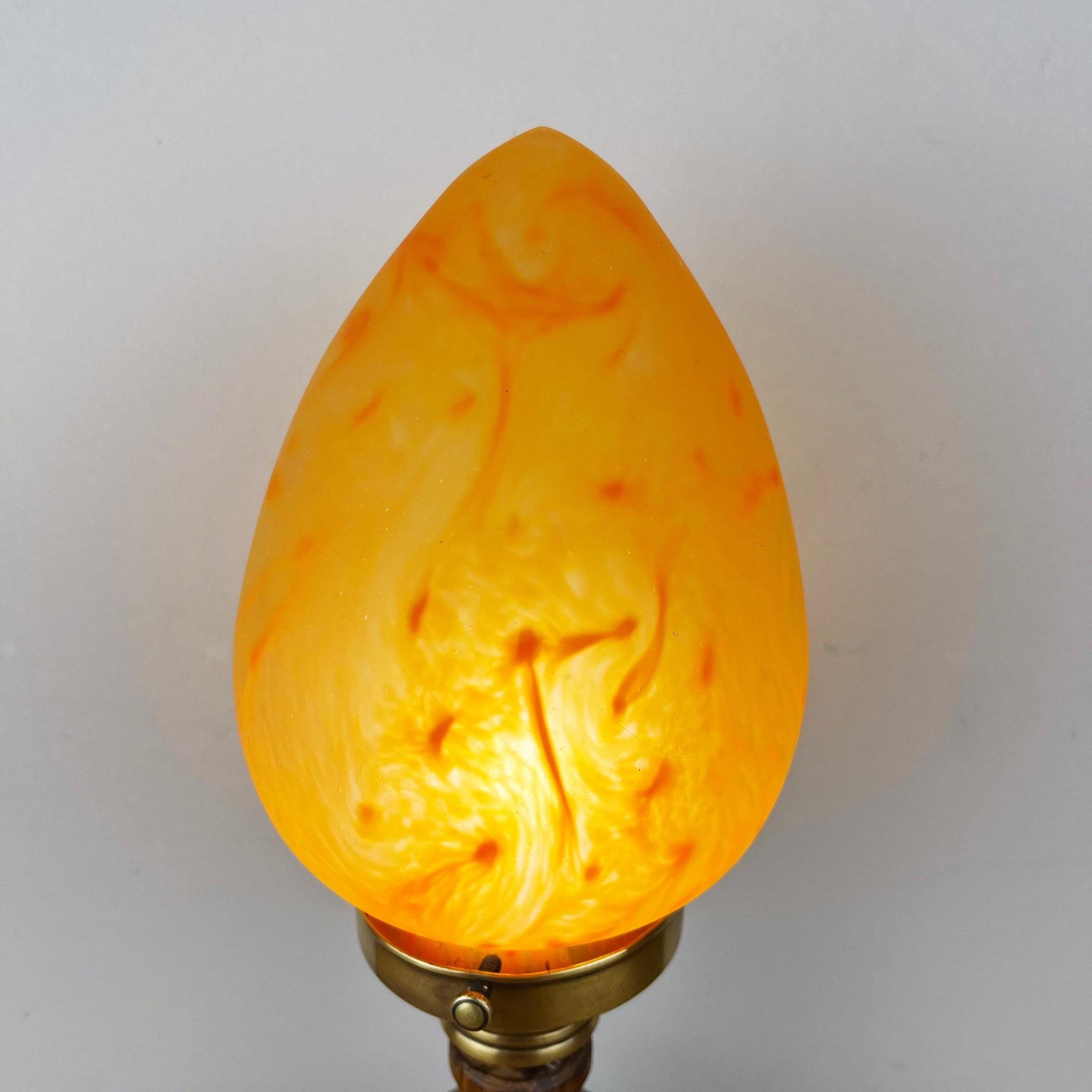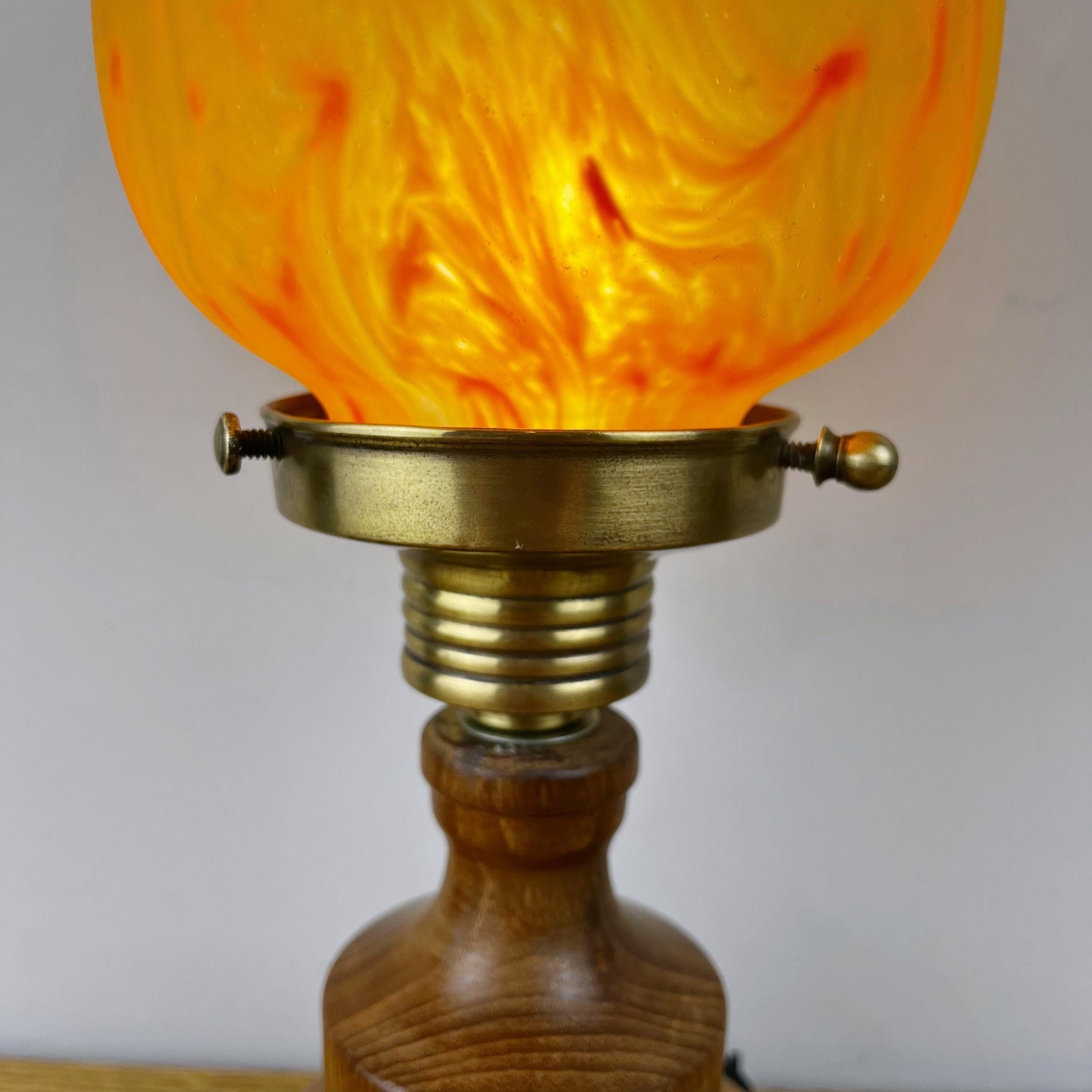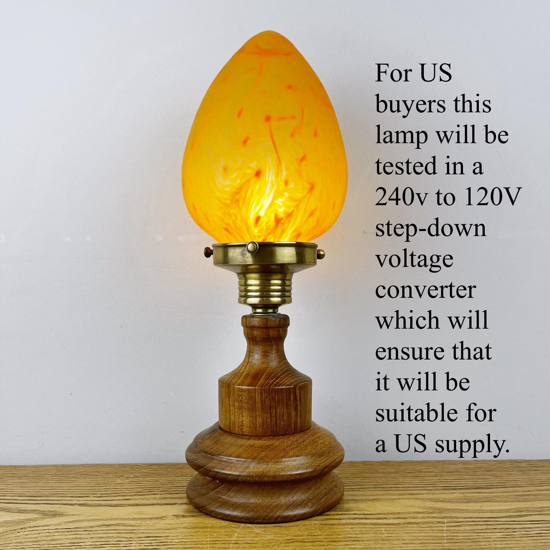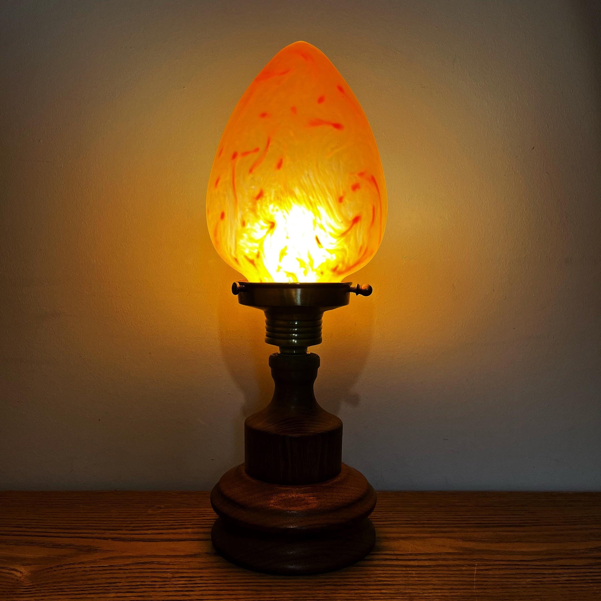 This vintage Art Nouveau lamp is a lovely example of 1920s home decor. The stepped styling of the wooden base compliments the fabulous orange marbled glass teardrop shade. It will make a gorgeous accent piece in a vintage setting or in a lounge with a more modern contemporary look as an eye catching statement piece.