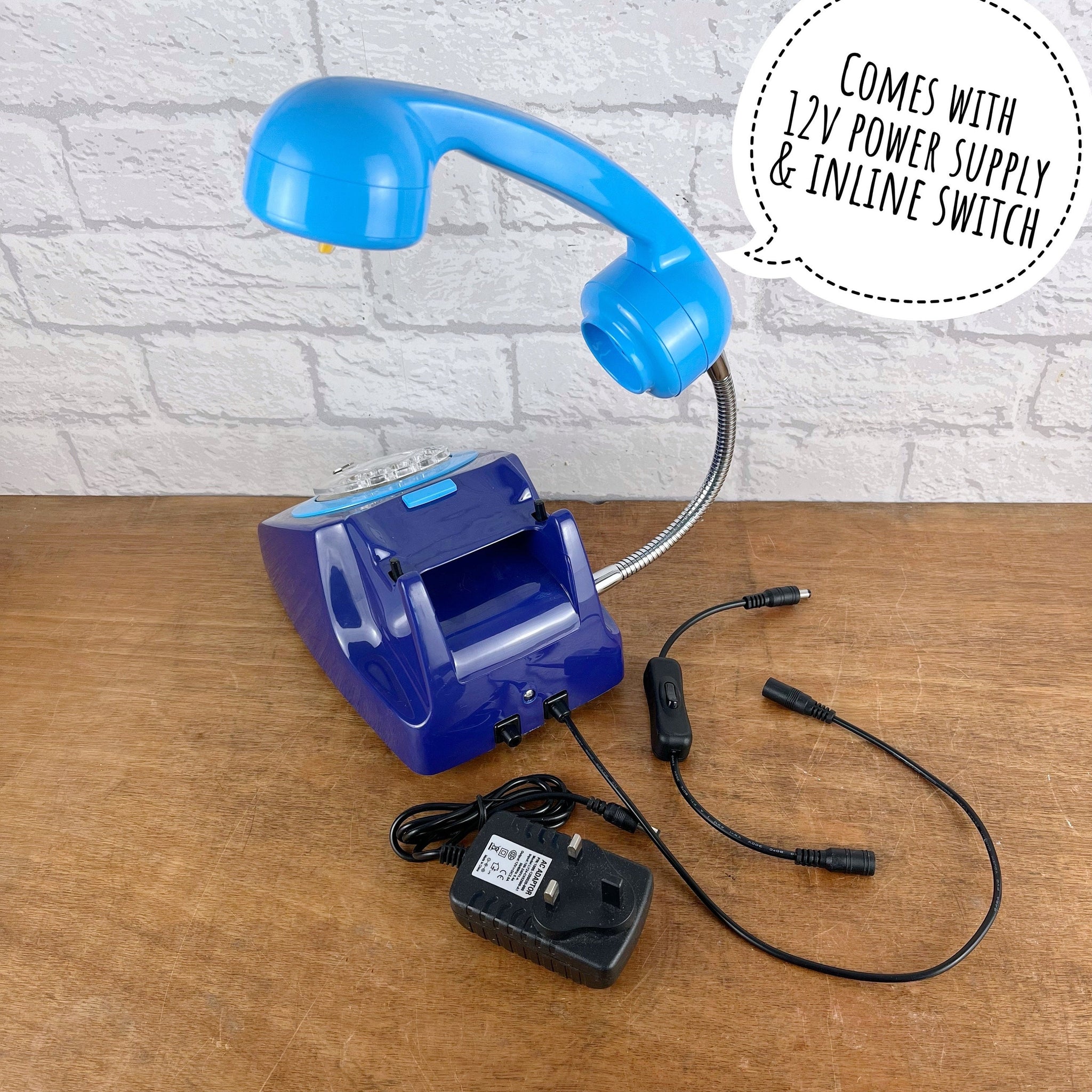 A quirky telephone desk lamp for a navy blue themed home office or bedside lighting for someone who likes unique retro decor or maybe you’re looking for a working from home gift to treat yourself. We have them available in different colours, this one is dark blue and sky blue.