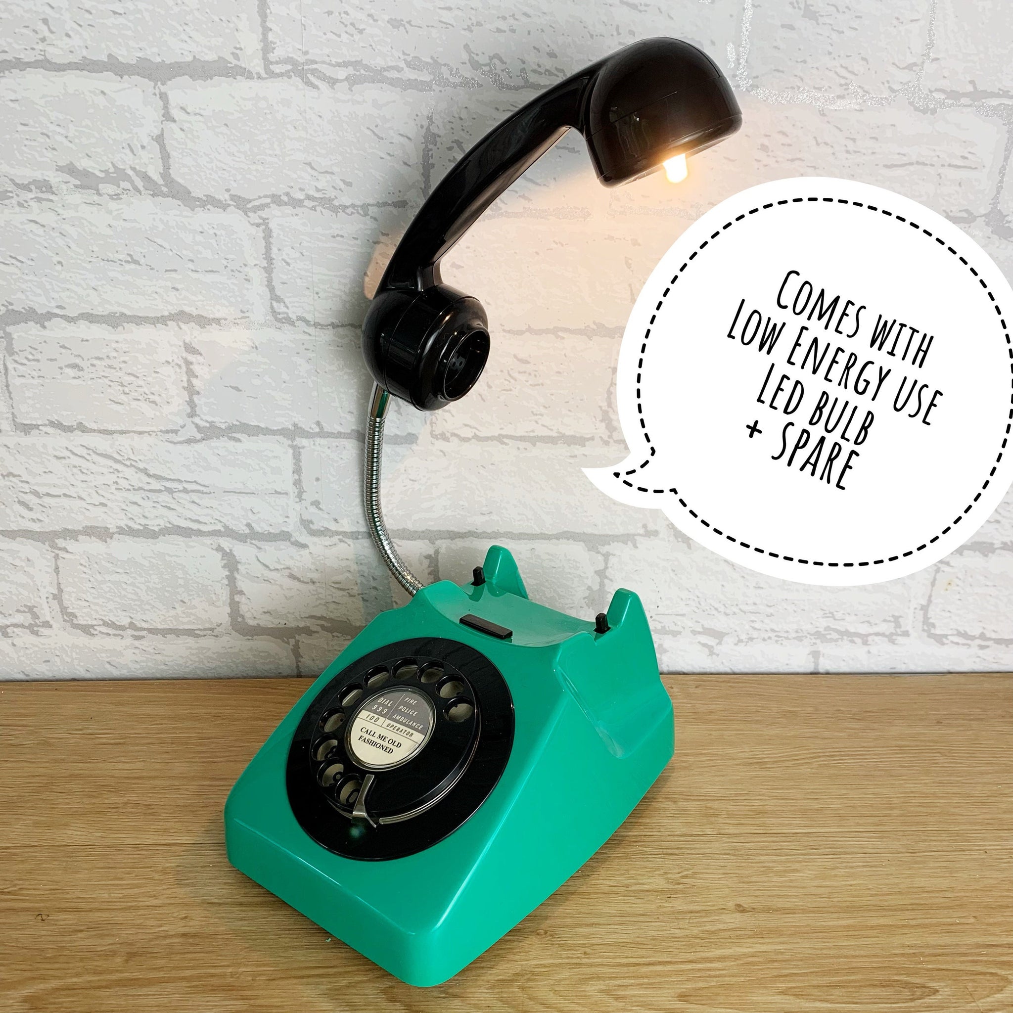 This lamp is from our premium range of converted telephones which have various uncommon features in comparison to our usual ones. This particular one features a bright emerald green coloured case put with an early 60s black dial, surround and handset.