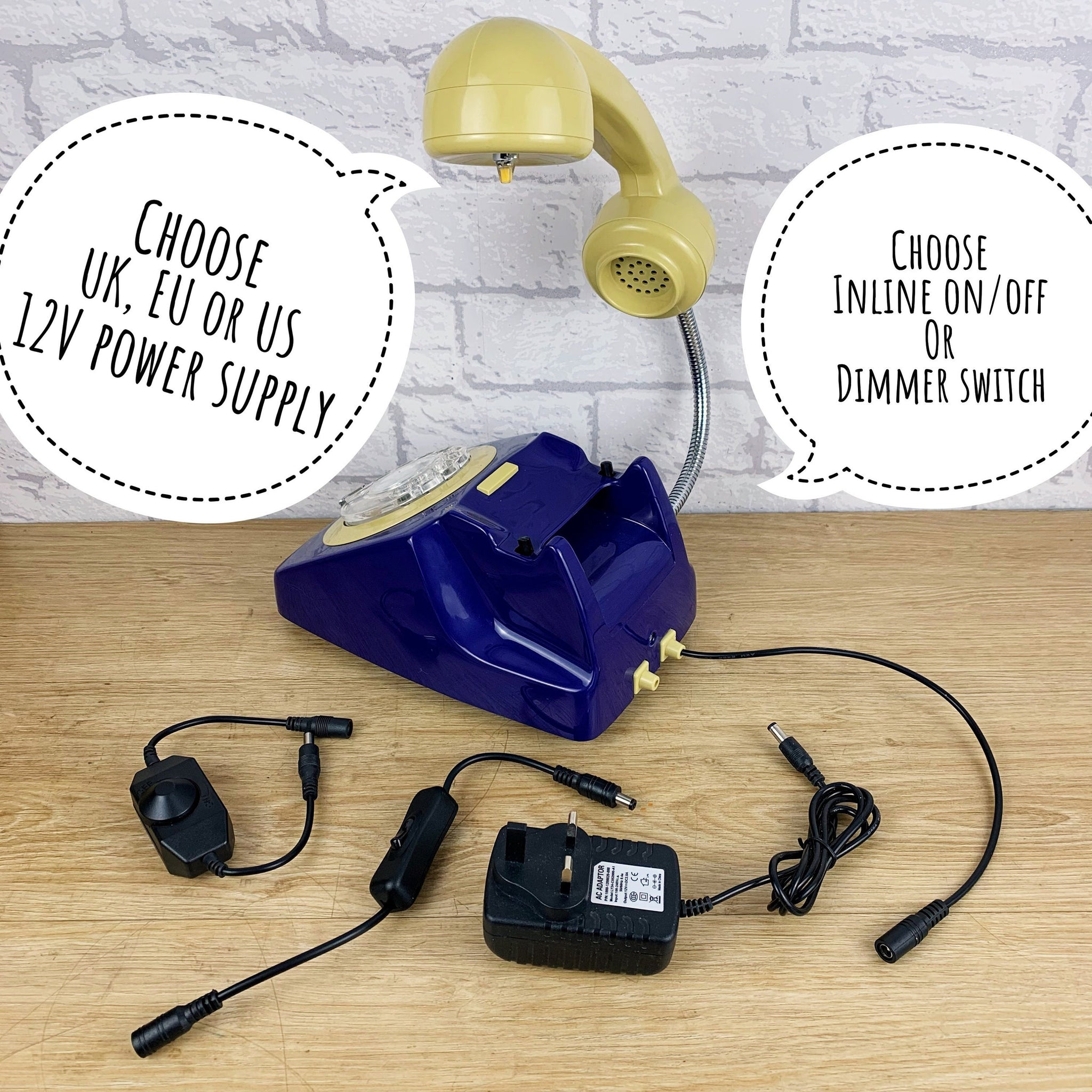 This fantastic retro telephone lamp is the perfect addition to your vintage style home office decor. It will sit perfectly on a desk in a study or on a sideboard or side table in a lounge or hallway. Our retro telephone lamps make the perfect gift for all ages but particularly those who remember when we used to take forever to dial any ones number. Imagine the look on their face when they realise that the once iconic black telephone is now also a very useful lamp which can be flexed to use as an accent lamp or used as a reading lamp. We have them available in different colours. This one is concorde blue and mustard.