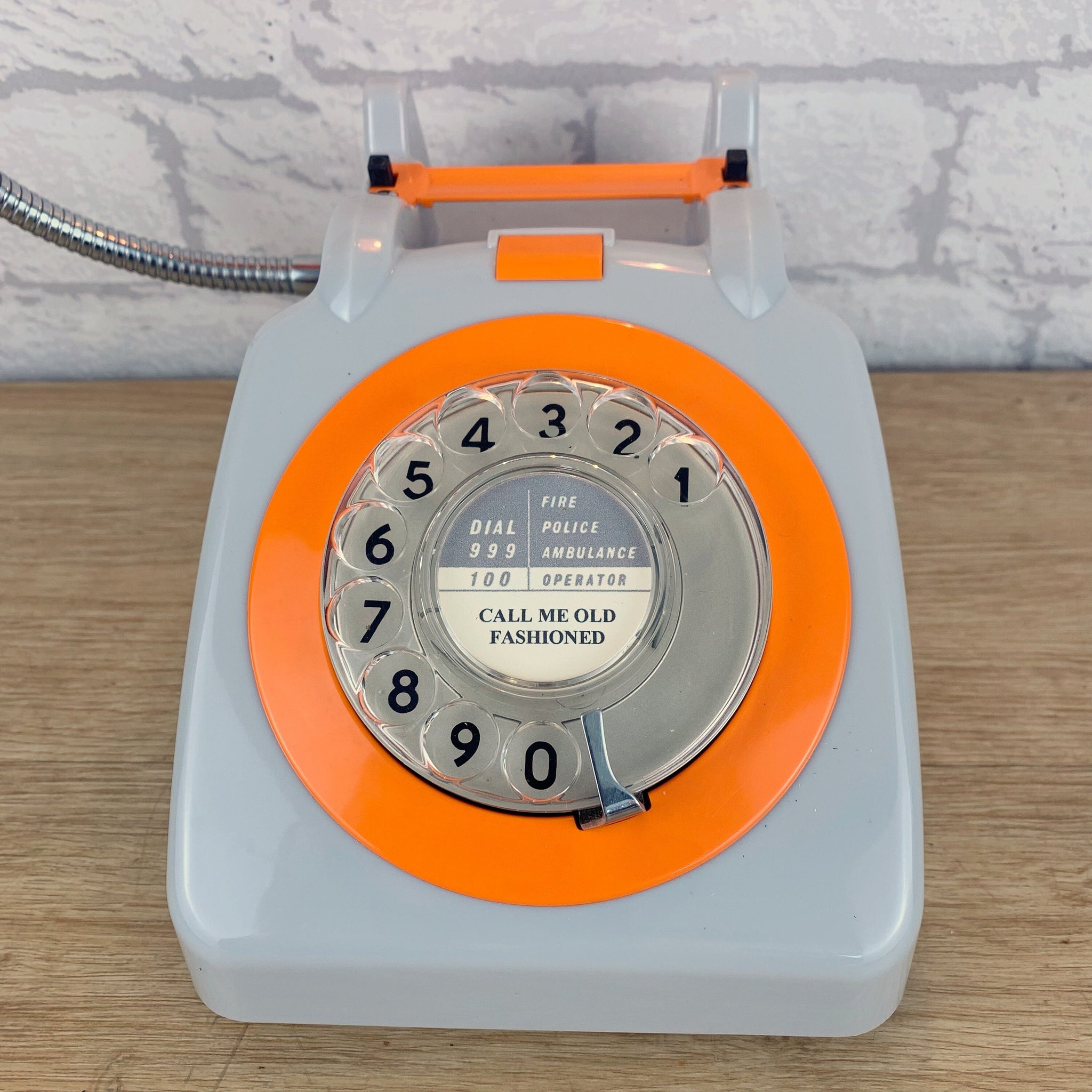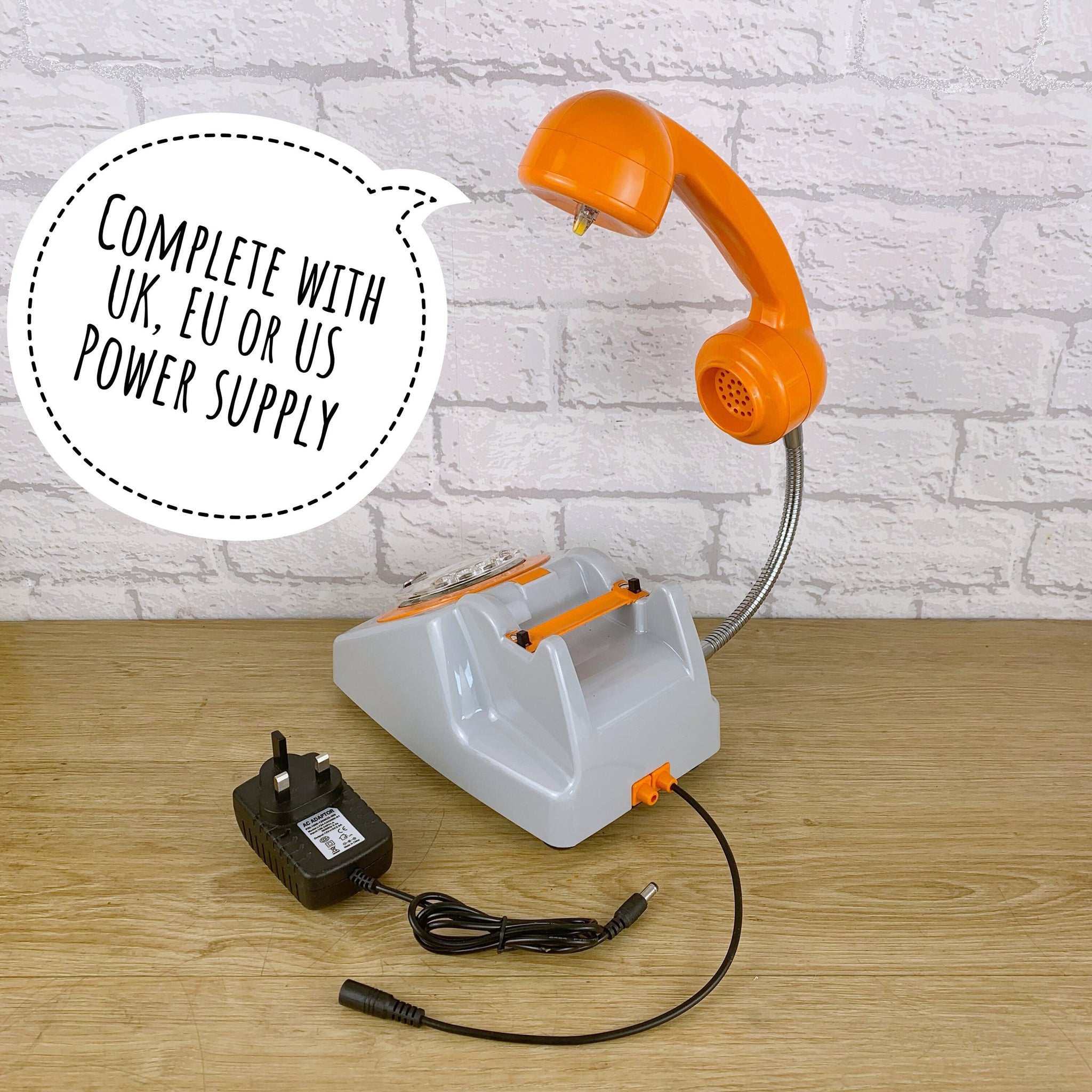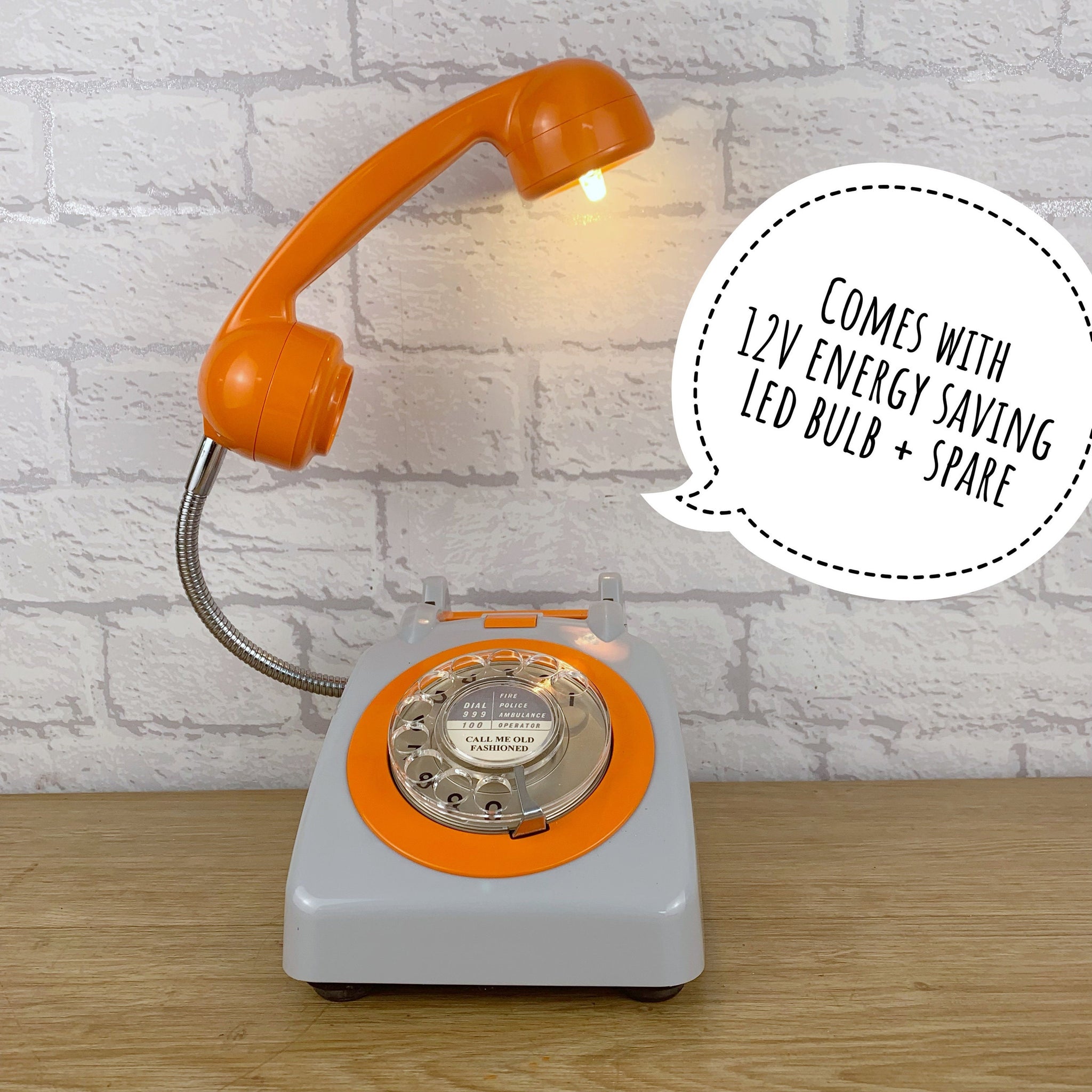 This lamp is from our premium range of converted telephones which have various uncommon features in comparison to our usual ones. This particular one features a pale grey coloured case put with an orange dial, surround and handset.