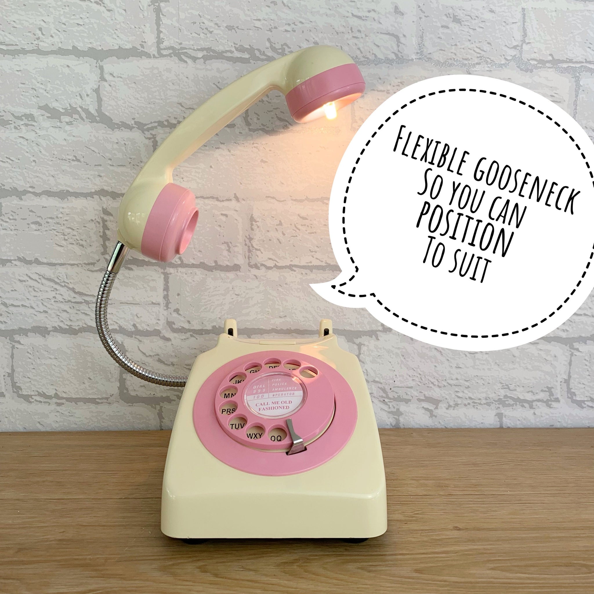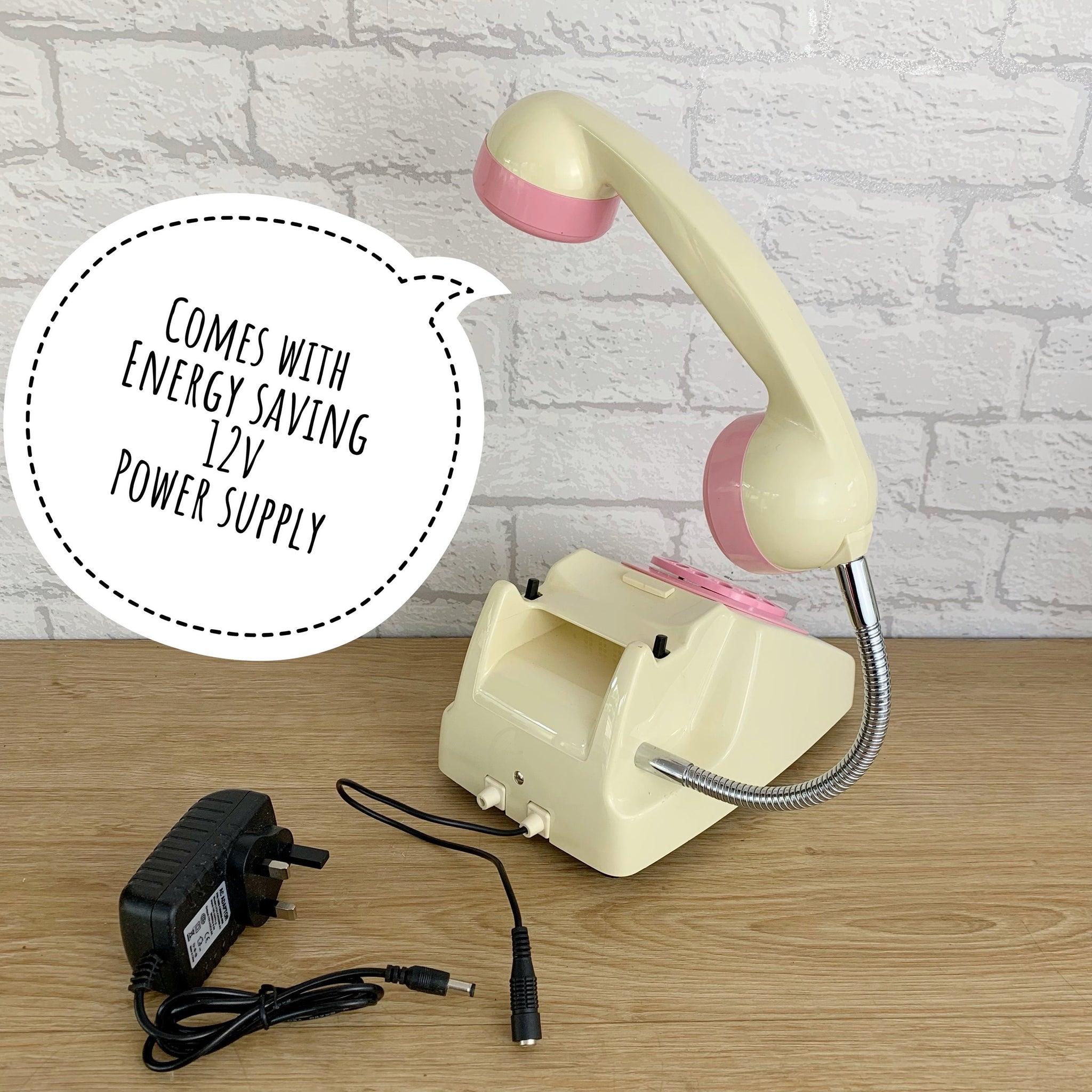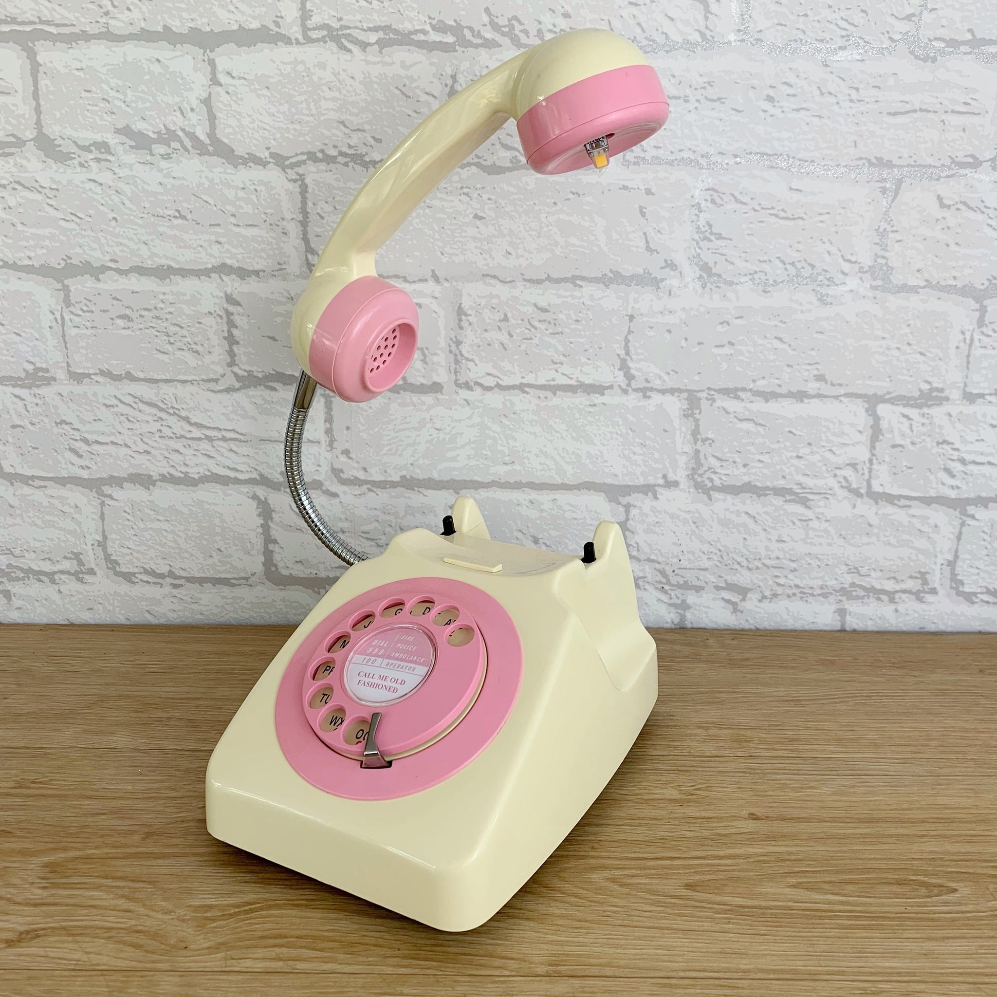This lamp is from our premium range of converted telephones which have various uncommon features in comparison to our usual ones. This particular one features a pink coloured case put with an early 60s cream dial, surround and handset.