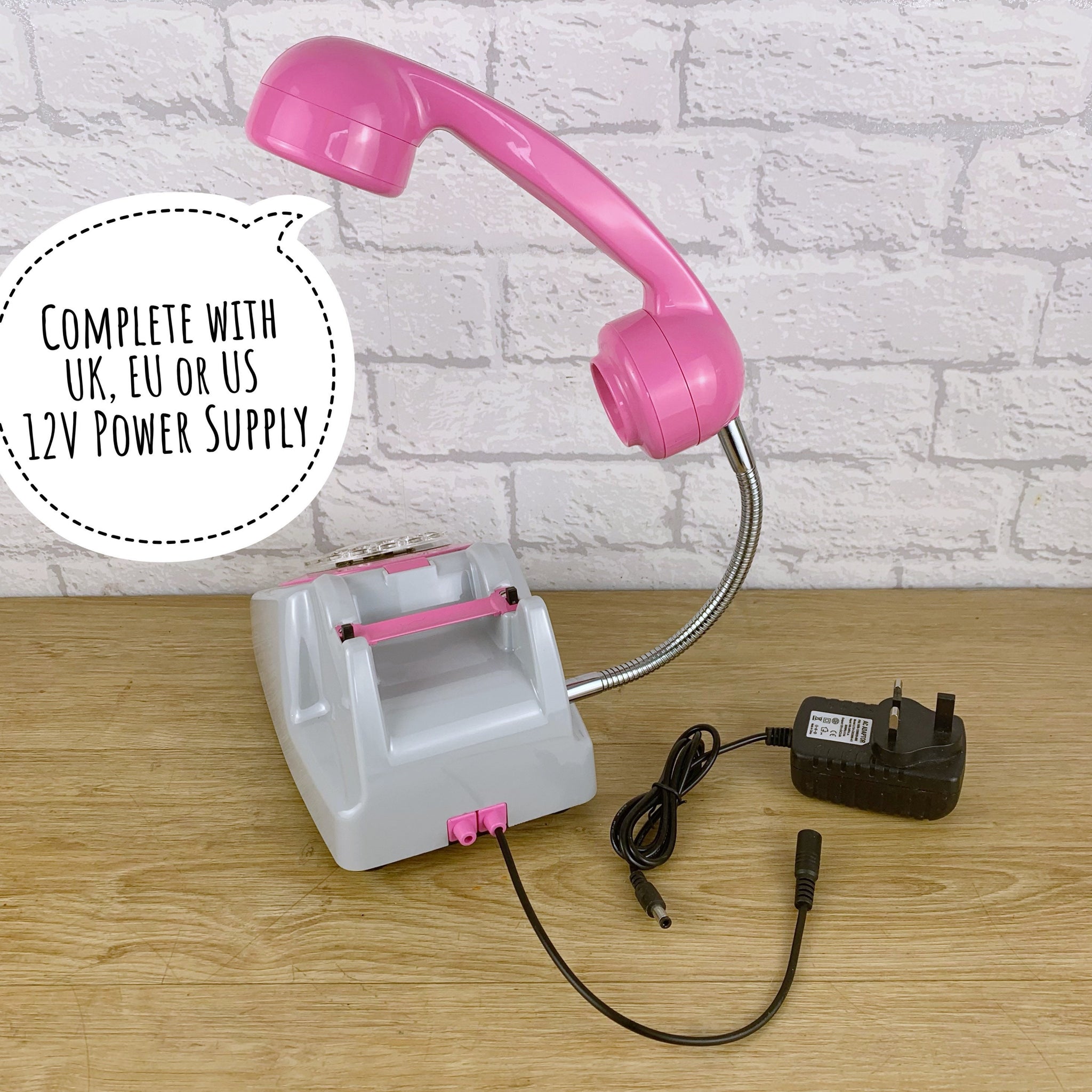 This lamp is from our premium range of converted telephones which have various uncommon features in comparison to our usual ones. This particular one features a pale grey coloured case put with a pink dial, surround and handset.