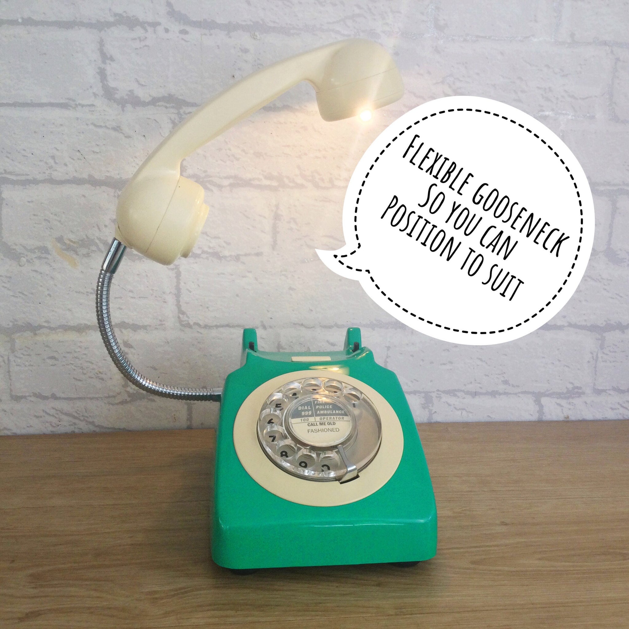 A quirky lamp made from a retro phone. The base of the lamp is a bright emerald green rotary phone with a cream dial ring. The cream handset mounted on a flexible gooseneck has a small LED bulb in the receiver converting it into a fabulous lamp.